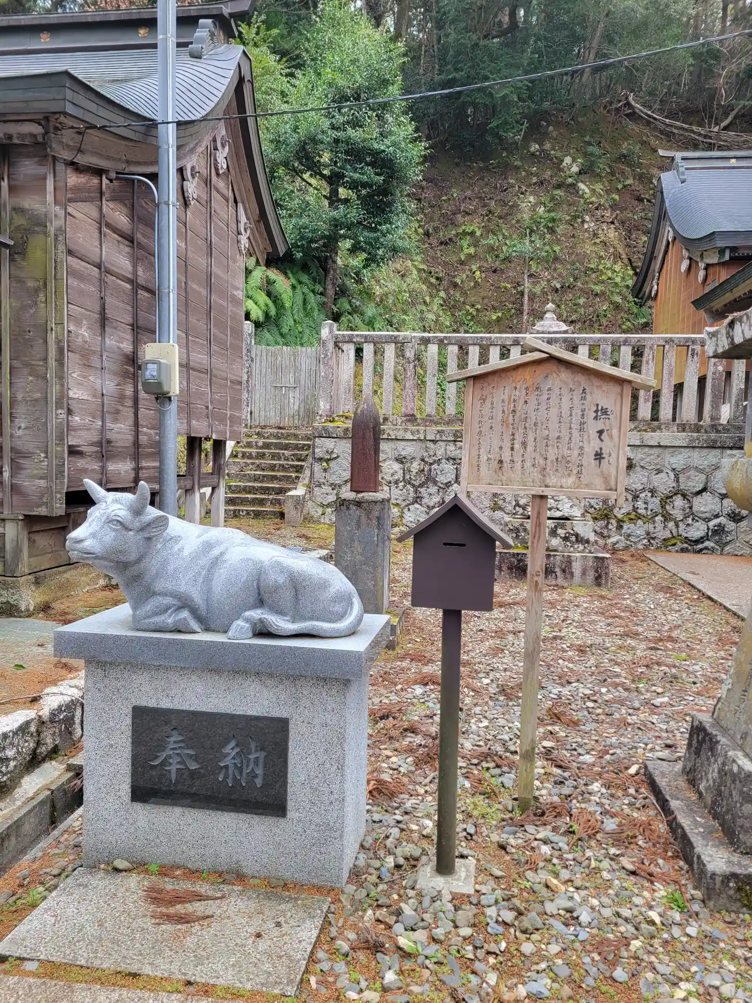 社殿の左側にある<撫で牛>。ここから左方向(東方向)の境内社を順に見ていく。