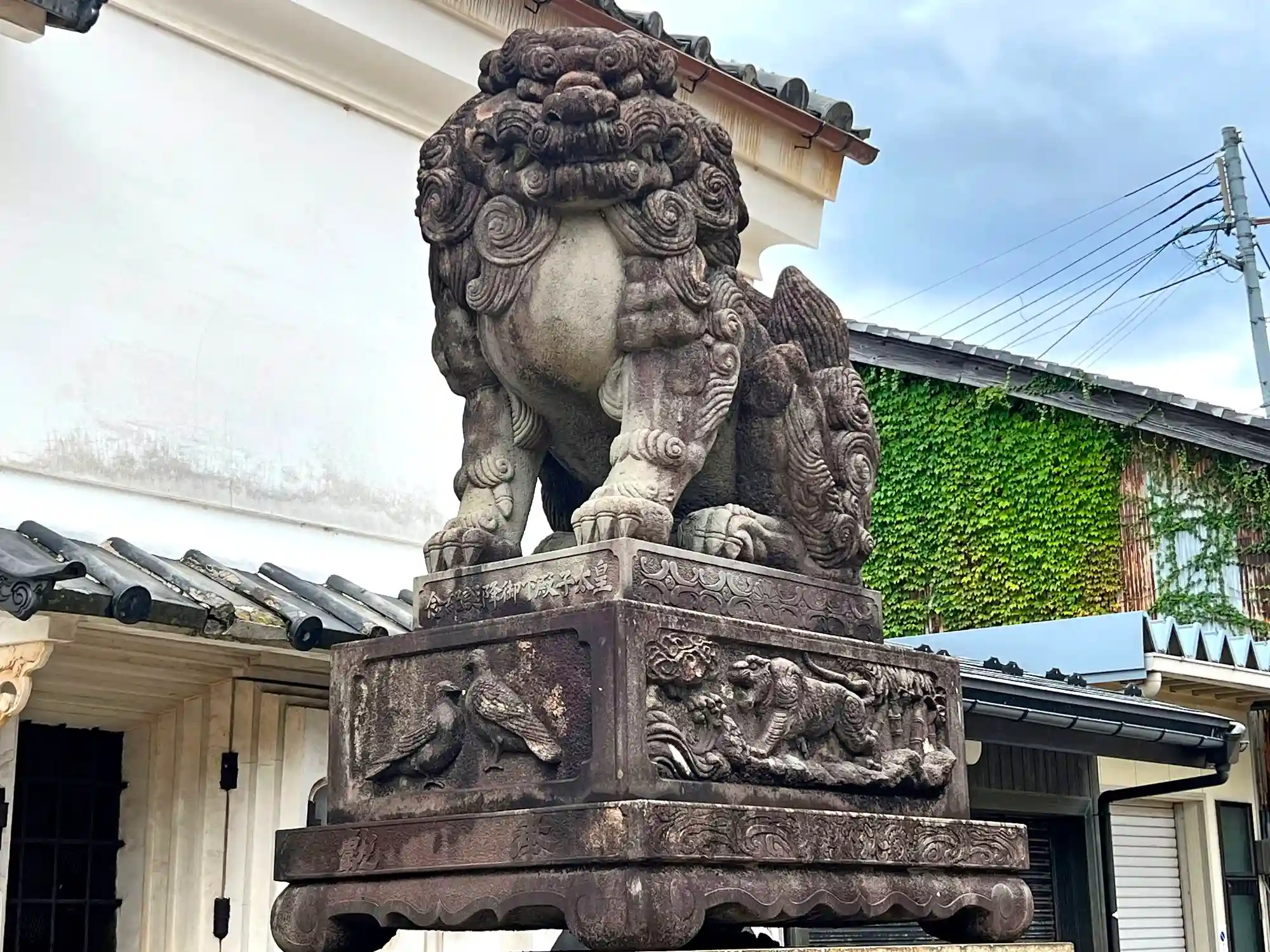 右側の<狛犬>。狛犬の毛並みといい、土台の装飾といい、かなり贅が尽くされている。