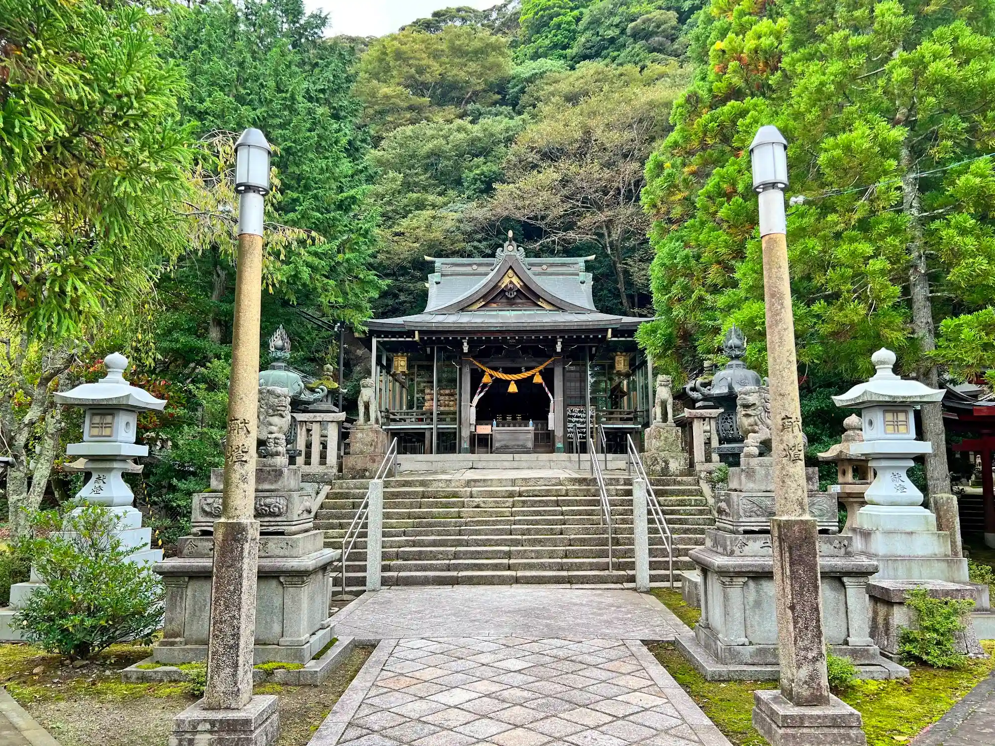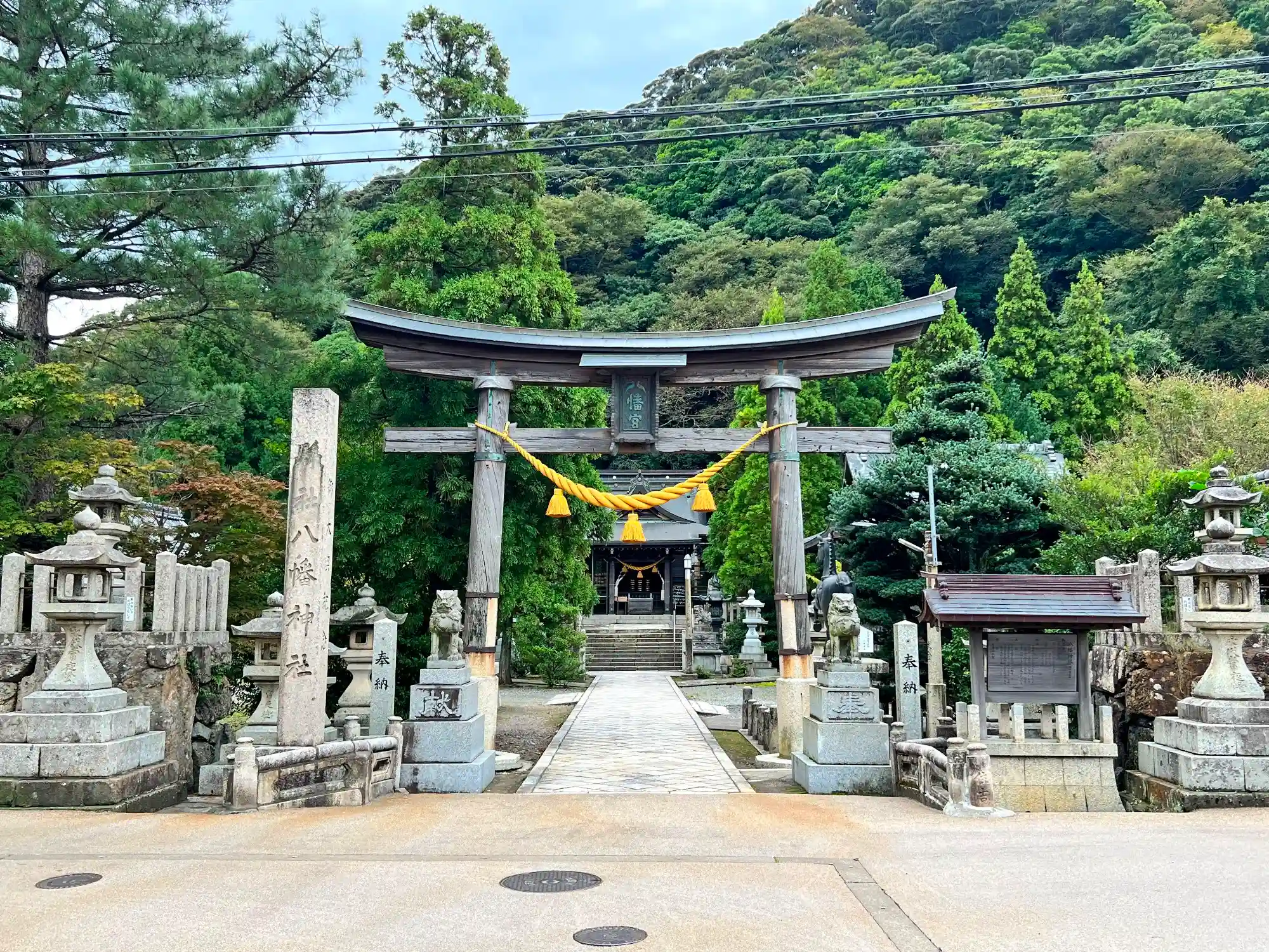 当社は、JR小浜線・小浜駅の西方400mの小山の北麓、海まで数百mの市街地の南の外れにある。歴代領主の庇護を受けてきたというだけあって、まずまずの広さの境内には奉納物がぎっしりで、特に境内外の参道上の立派な一の鳥居・狛犬は印象に残る。境内は基本平らで、社殿周りのみ、一段高いところにある。社殿周りにはたくさんの境内社があって、神様のデパート状態なのも印象的。
