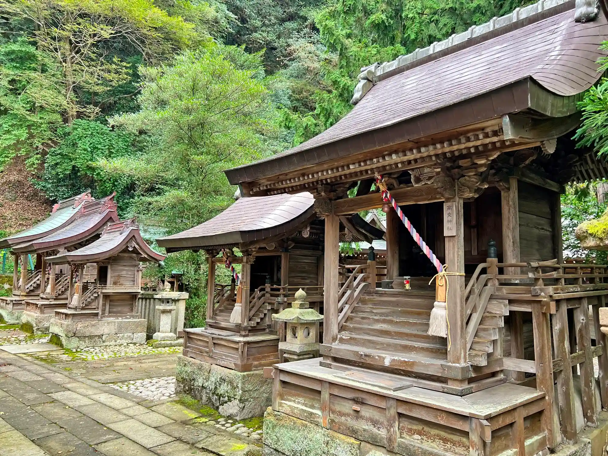 社殿の右側の境内社5社。手前の2社が<高良神社>、<六月祓神社>(珍しい社名)。