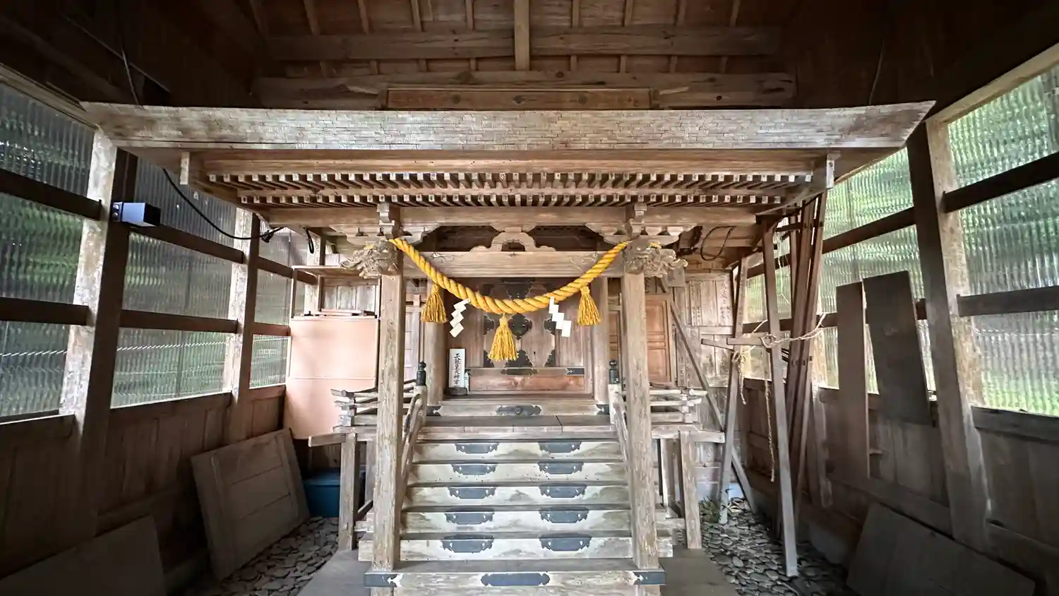 一の鳥居をくぐると左には公園と伏原公会堂 二の鳥居を抜けると拝殿が正面に見えますが、補強しているの…