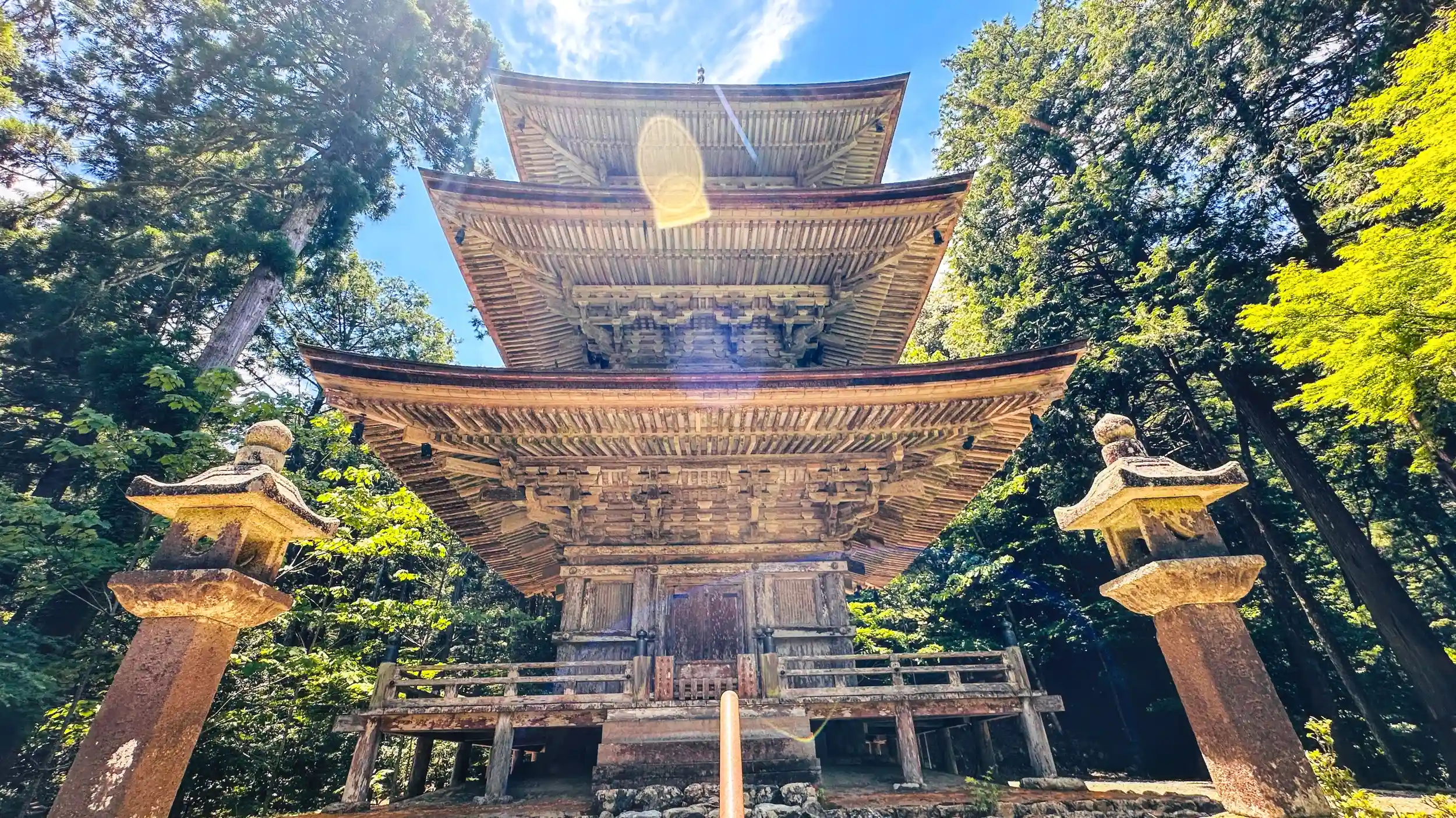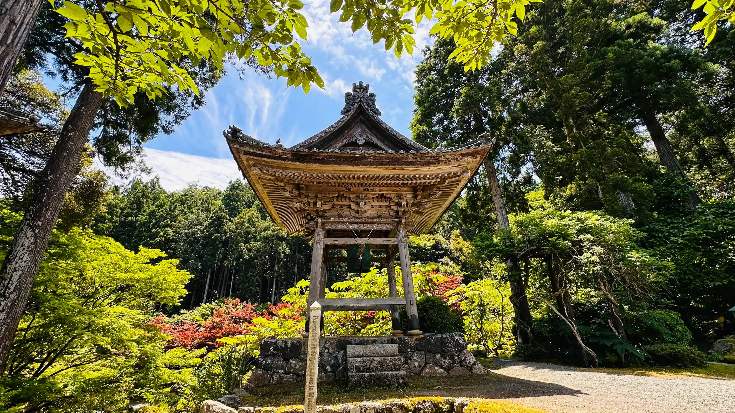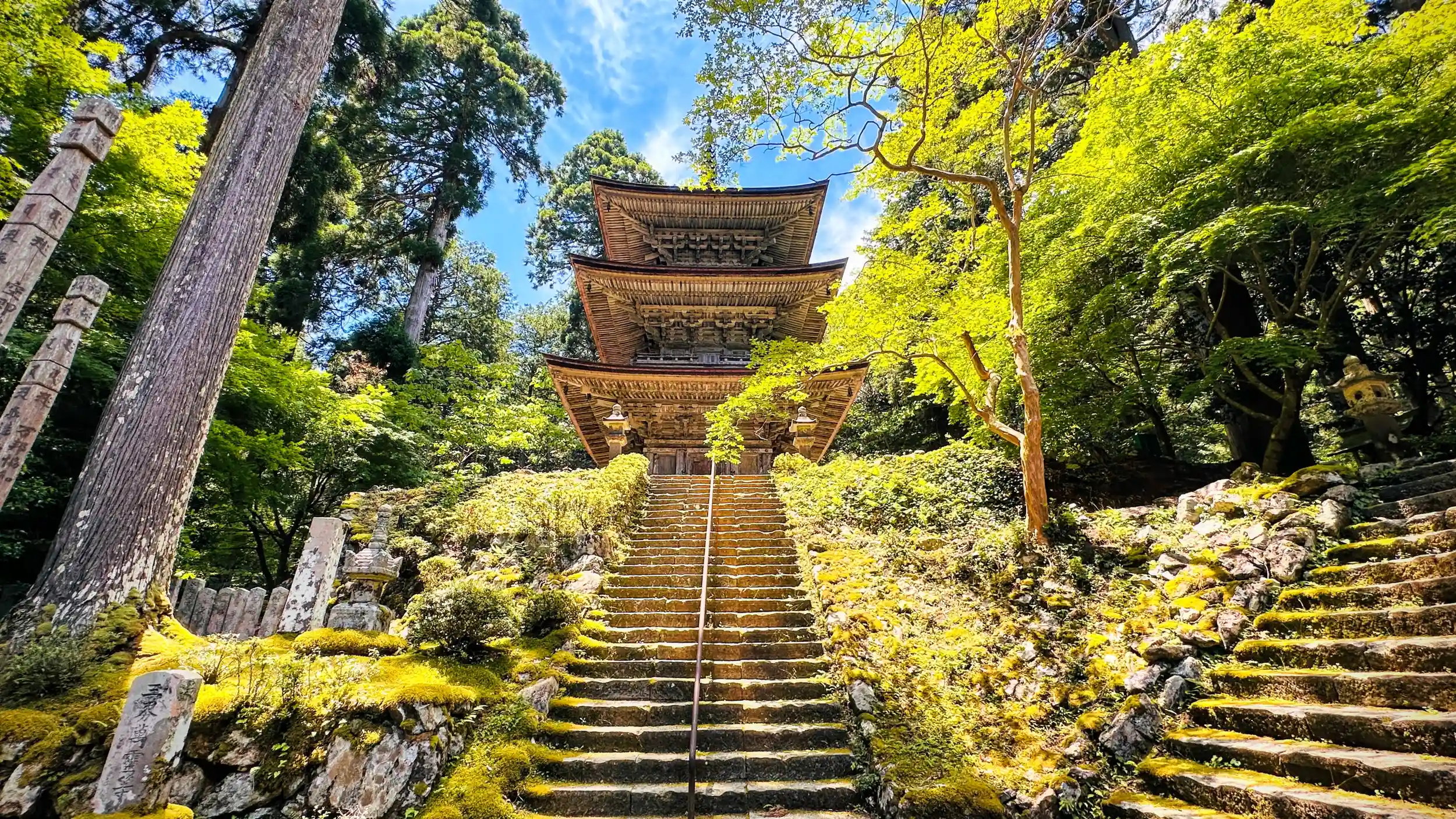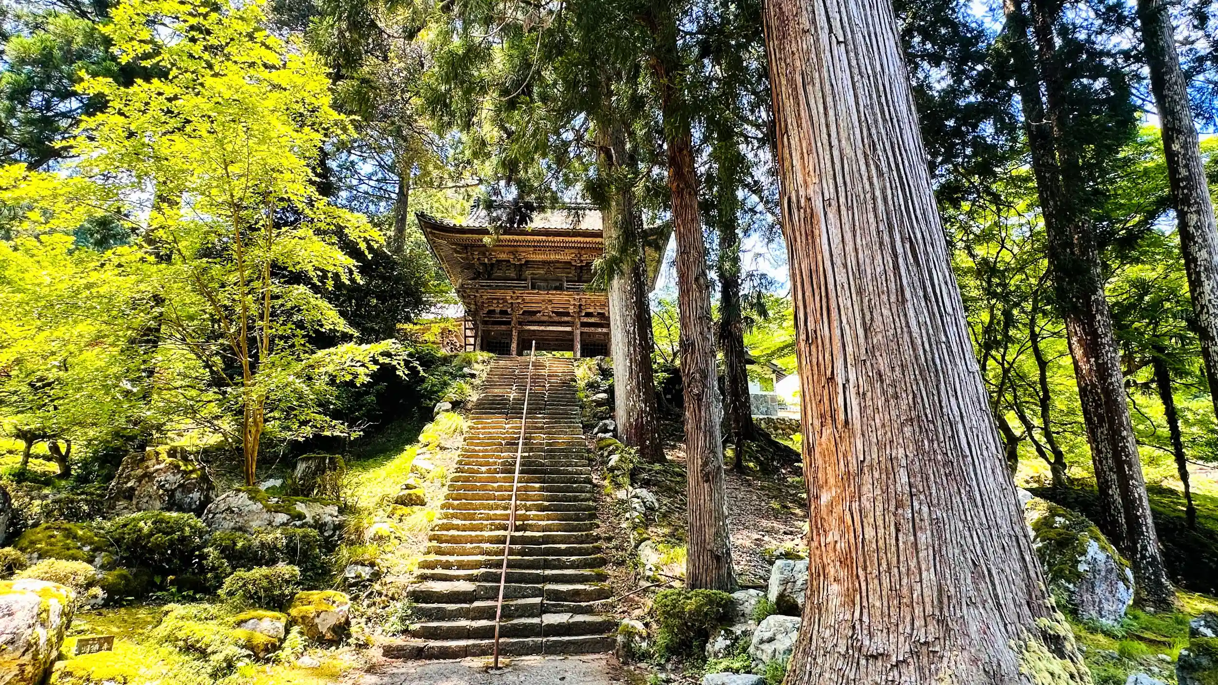 棡山 明通寺 真言宗御室派の寺院、ご本尊は薬師如来。坂上田村麻呂創建と伝わる真言宗寺院 。本堂と三重塔は、建造物としては福井県内で唯一国宝です、ここも青もみじが目に優しく映ります。 重要文化財も多く 薬師如来坐像 、降三世明王立像 、深沙大将立像 、 不動明王立像、いづれも一木造の平安時代の物です、この大きさの市木造りの原木は相当な樹齢の物だと、説明して頂きました。