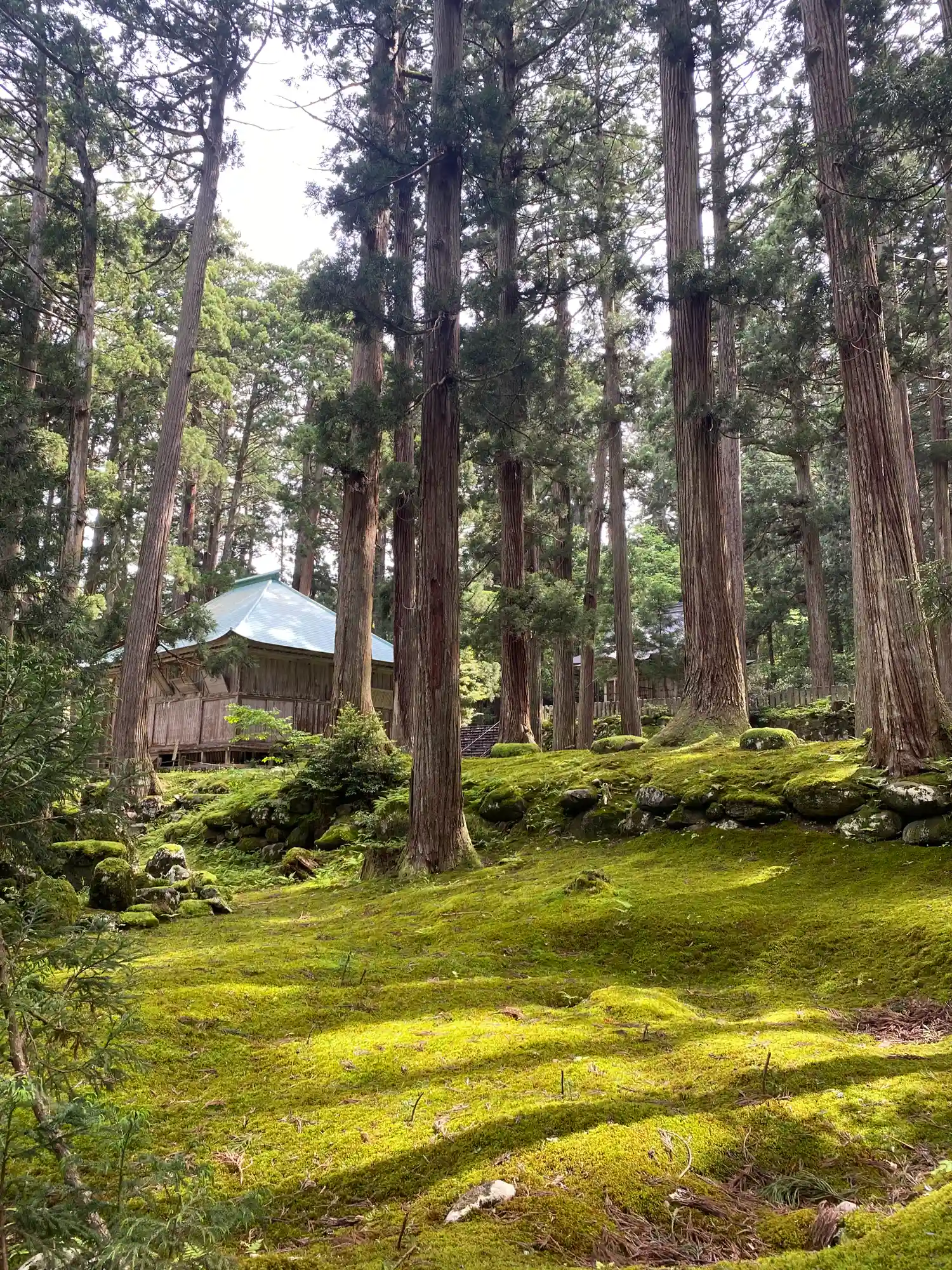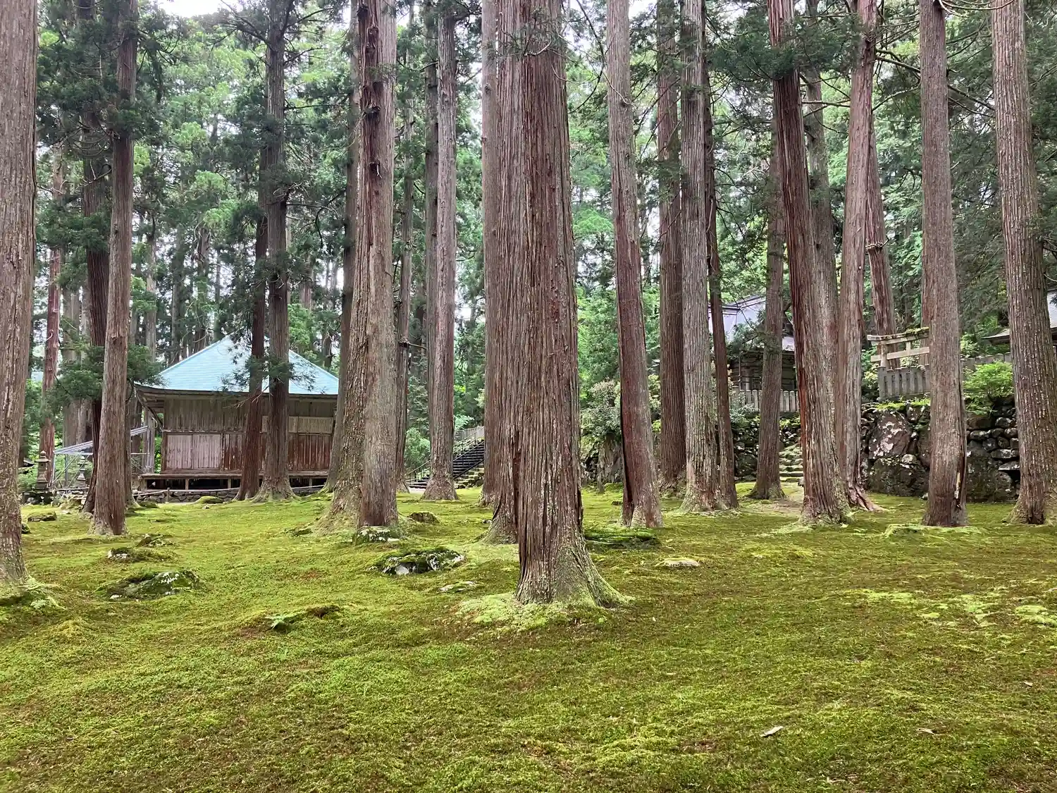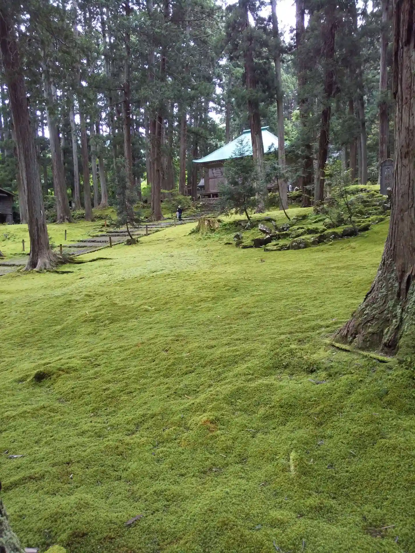 苔も見事、そしてその両脇に高く伸びた杉林もまた見事です。