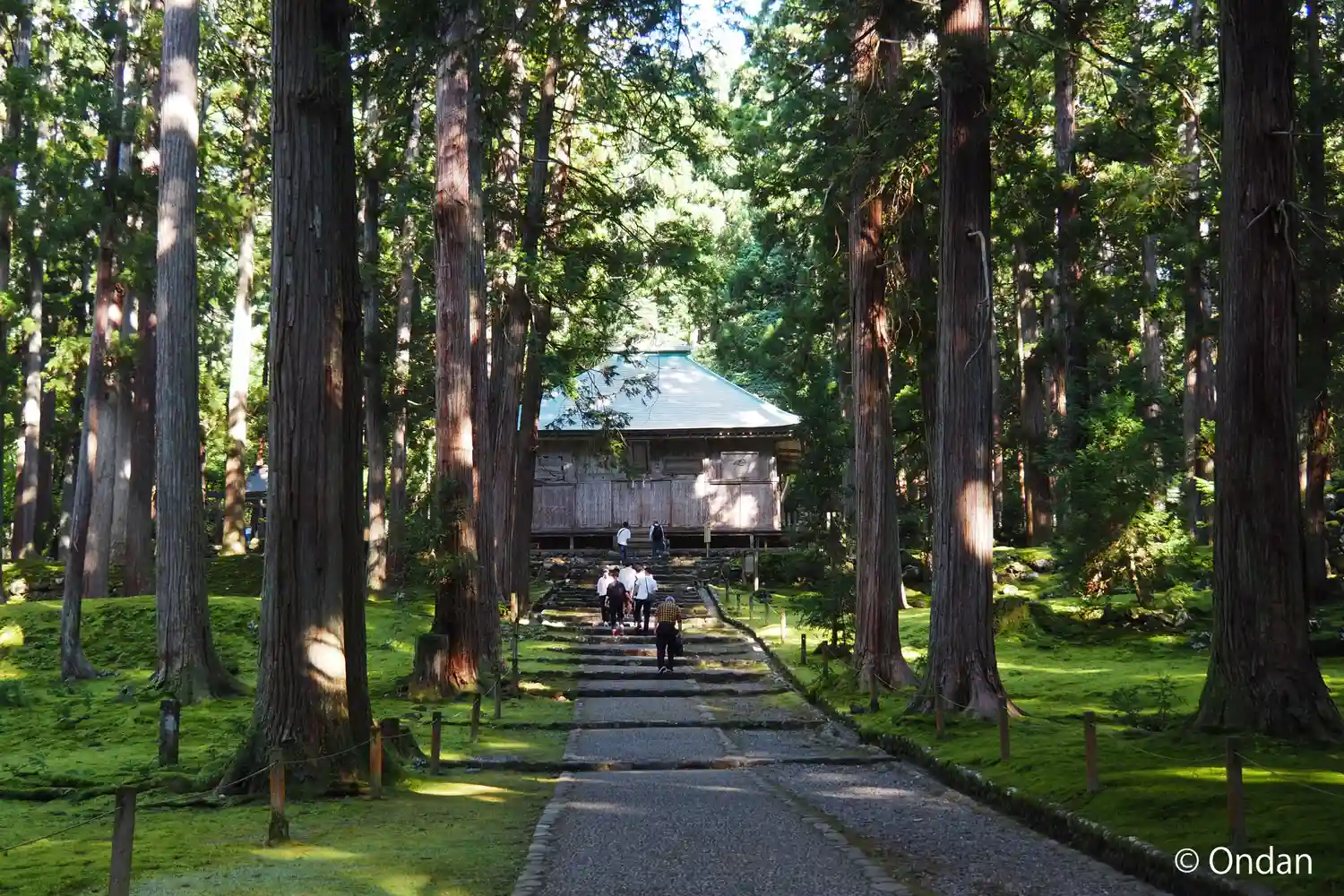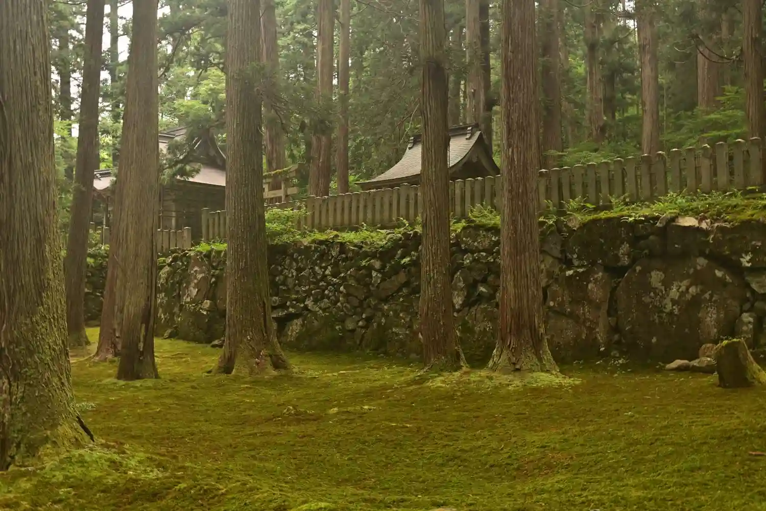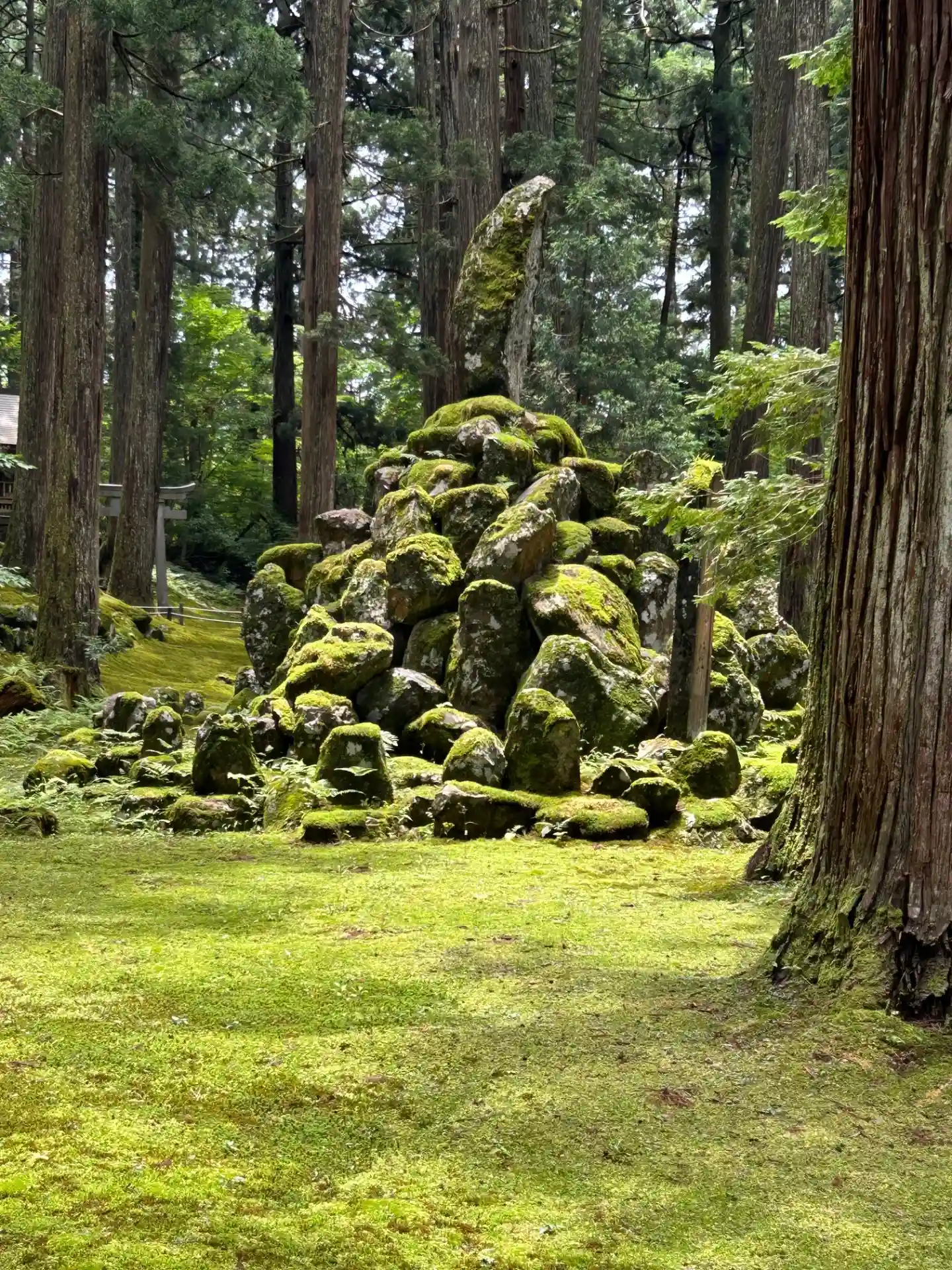 苔も見事、そしてその両脇に高く伸びた杉林もまた見事です。