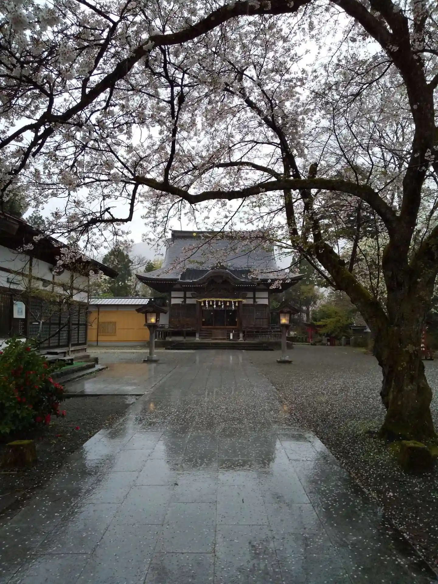 令和3年4月、桜の花が雨に濡れる大野市の篠座神社⛩️