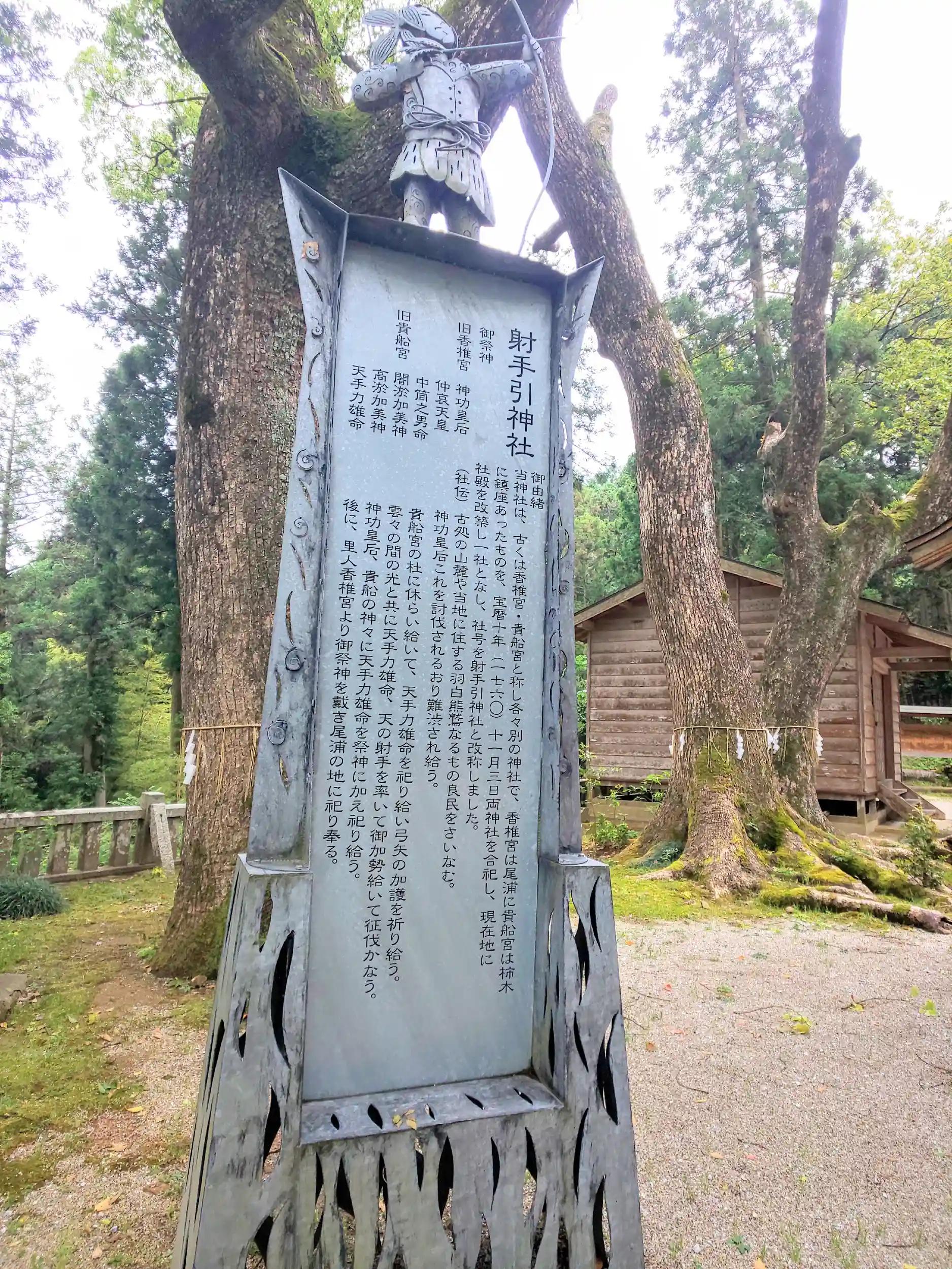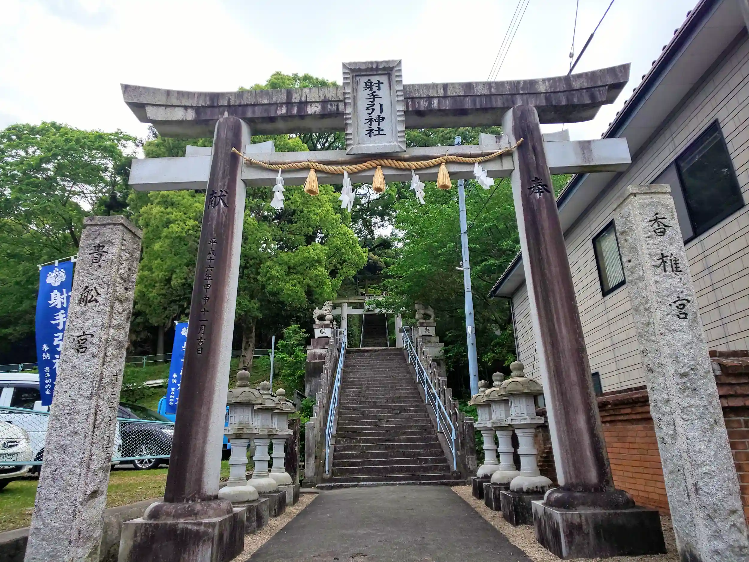 鳥居の両側にあるように、古くは各々別の神社でしたが、香椎宮、貴船宮両神社を合祀、現在地に社殿を改築、社号を射手引神社と改称した神社。