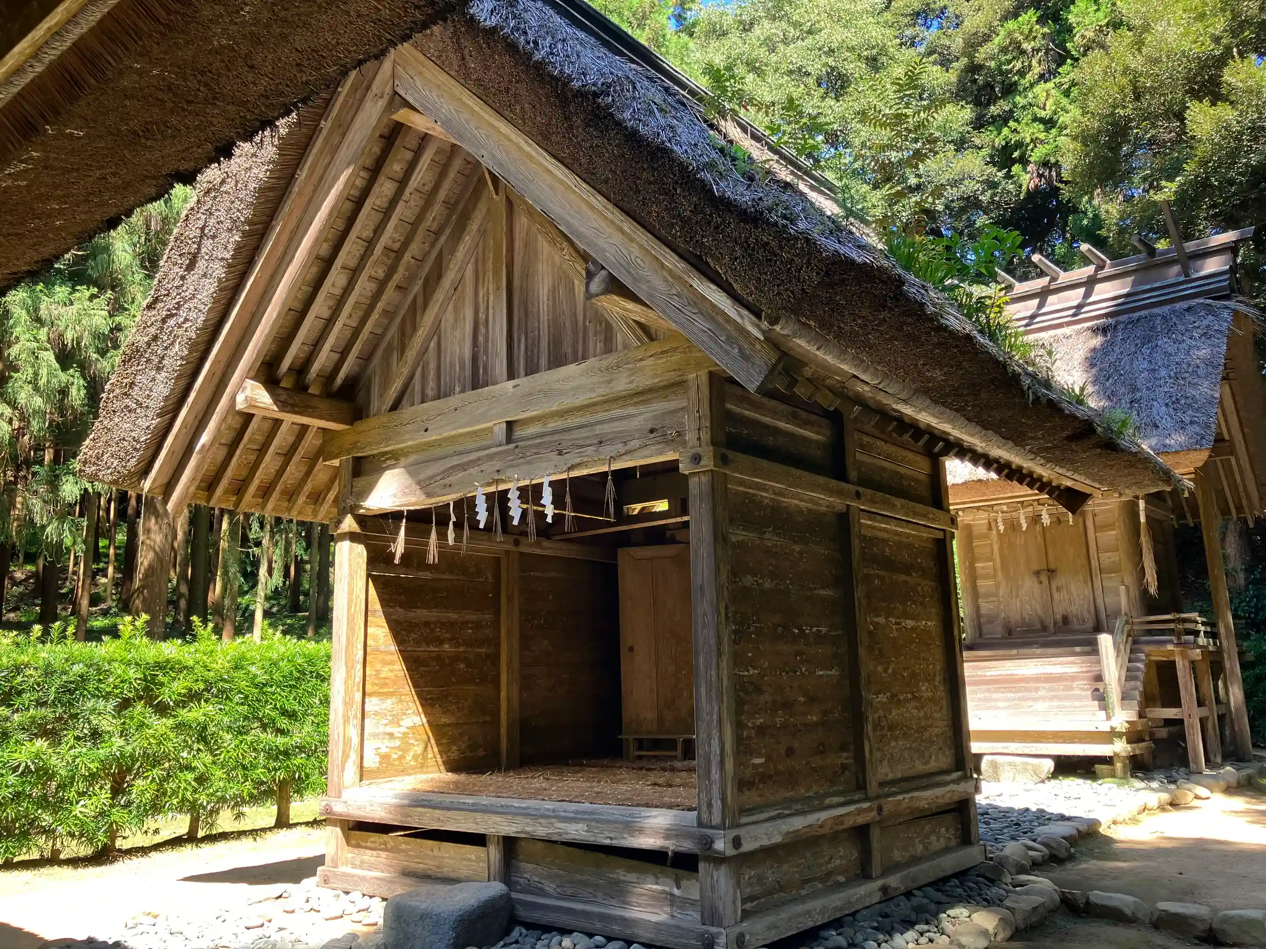 現在の社殿は1866年の建立。鳥居は外宮板垣北御門の鳥居を譲与され、2015年に移築されたものである。