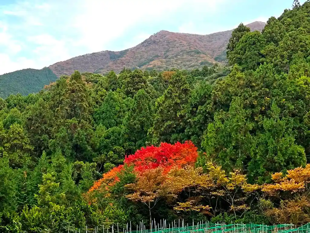 境内東方の山の眺め。1本だけ綺麗に紅葉が色づいている。(^▽^)/