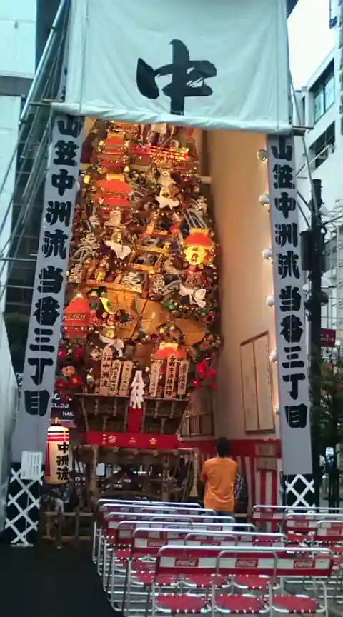 飾り山笠のお隣に夫婦銀杏