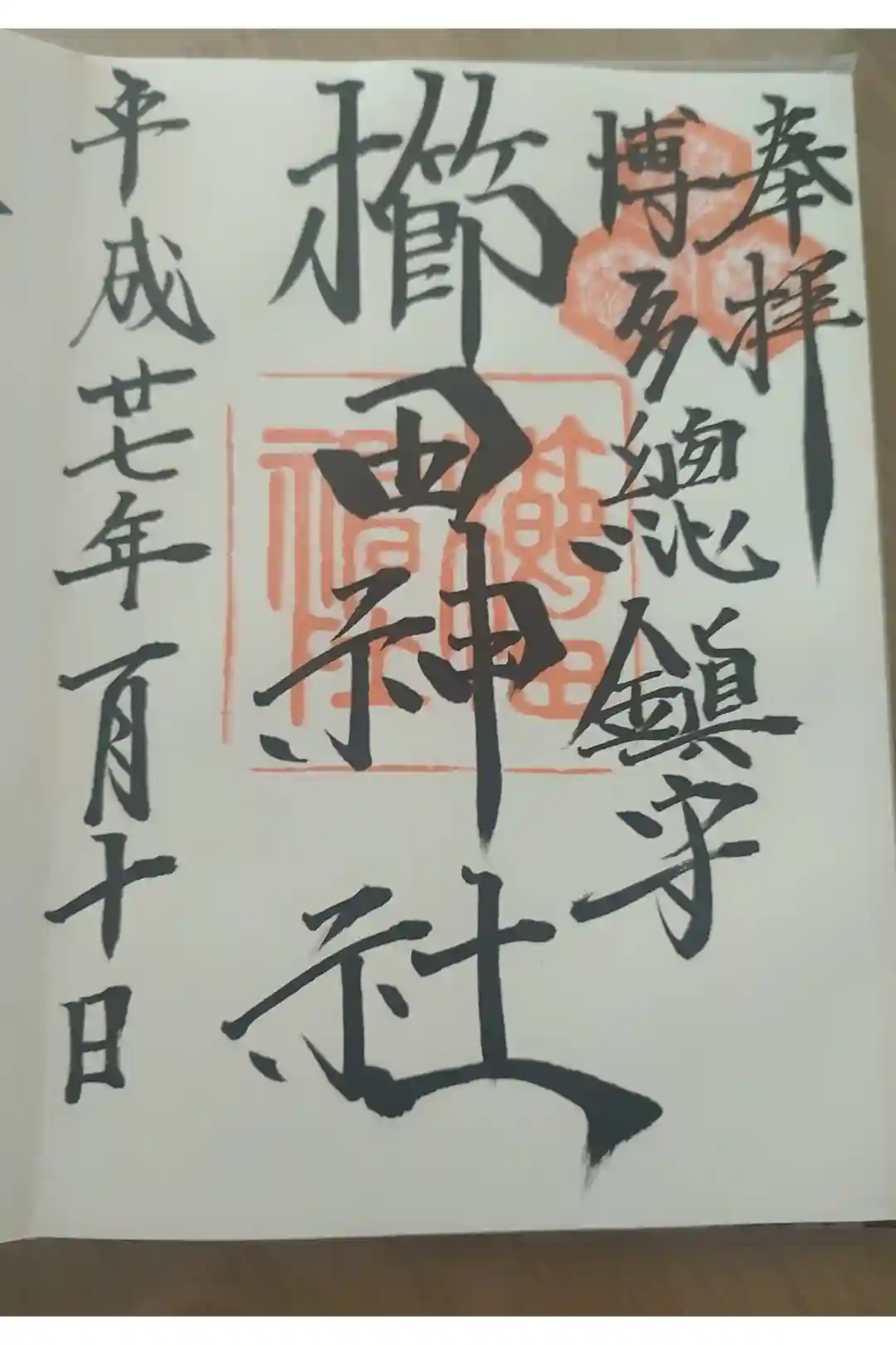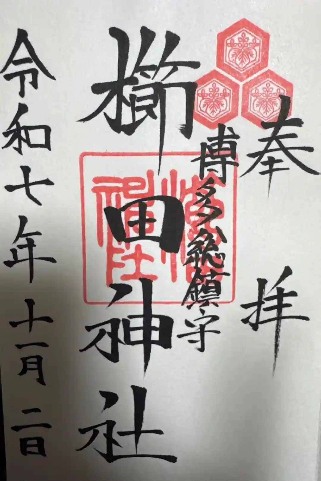 真ん中に櫛田神社、その右に博多総鎮守と書かれ、右上に三つ盛亀甲に五三桐の社紋の印、真ん中に櫛田神社の社印が押されています。