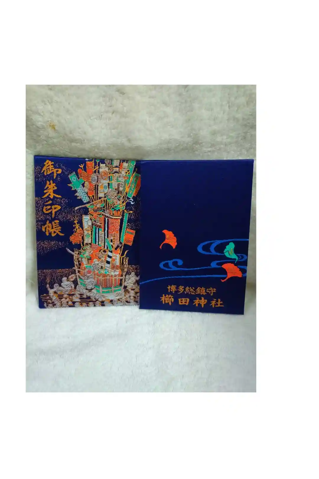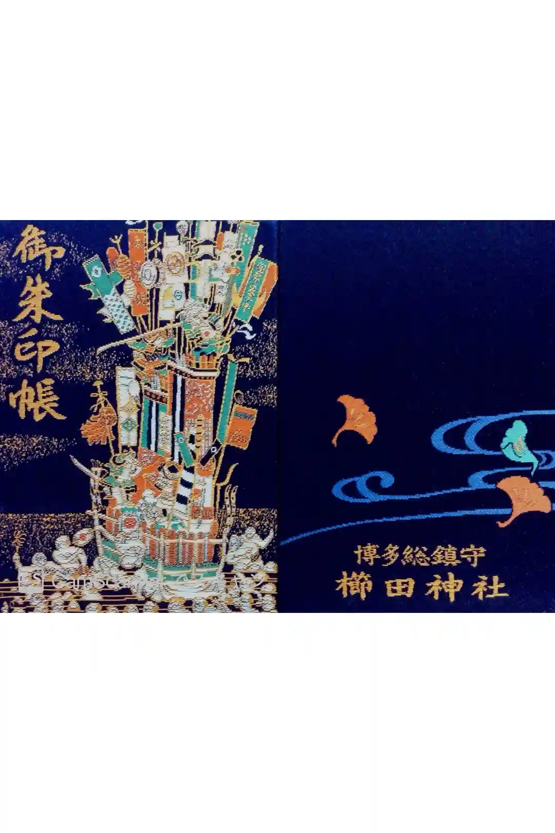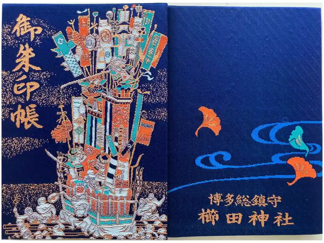 紺色の地に、表面には櫛田神社の祭礼である博多祇園山笠の風景が描かれ、裏面には銀杏の葉と博多総鎮守櫛田神社の文字が入っています。
