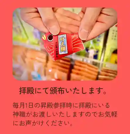 叶え鯛は、昇殿参拝でお参りいただいた方、朔日祭祭典にご参列いただいた方に神職巫女がお渡しいたします。