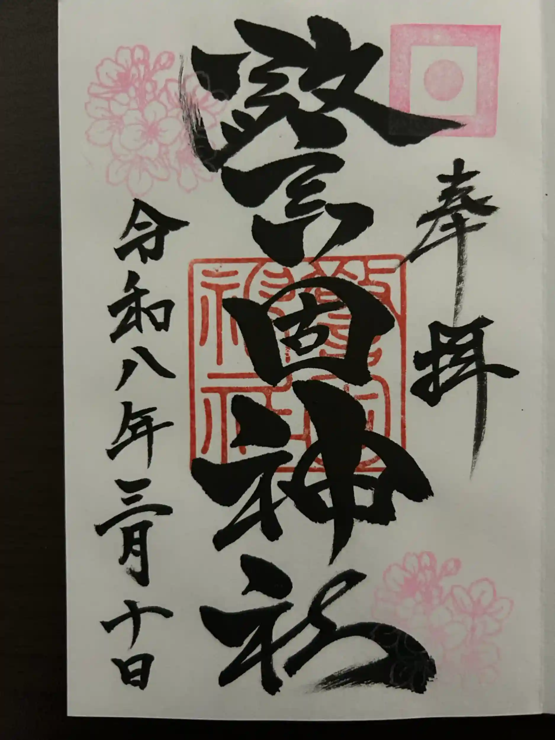 何度も参拝したことあったけど御朱印は初めてです。御朱印をいただける社務所はビルの中にあり、アロマなども販売されてました。季節限定の桜色のスタンプが素敵でした。