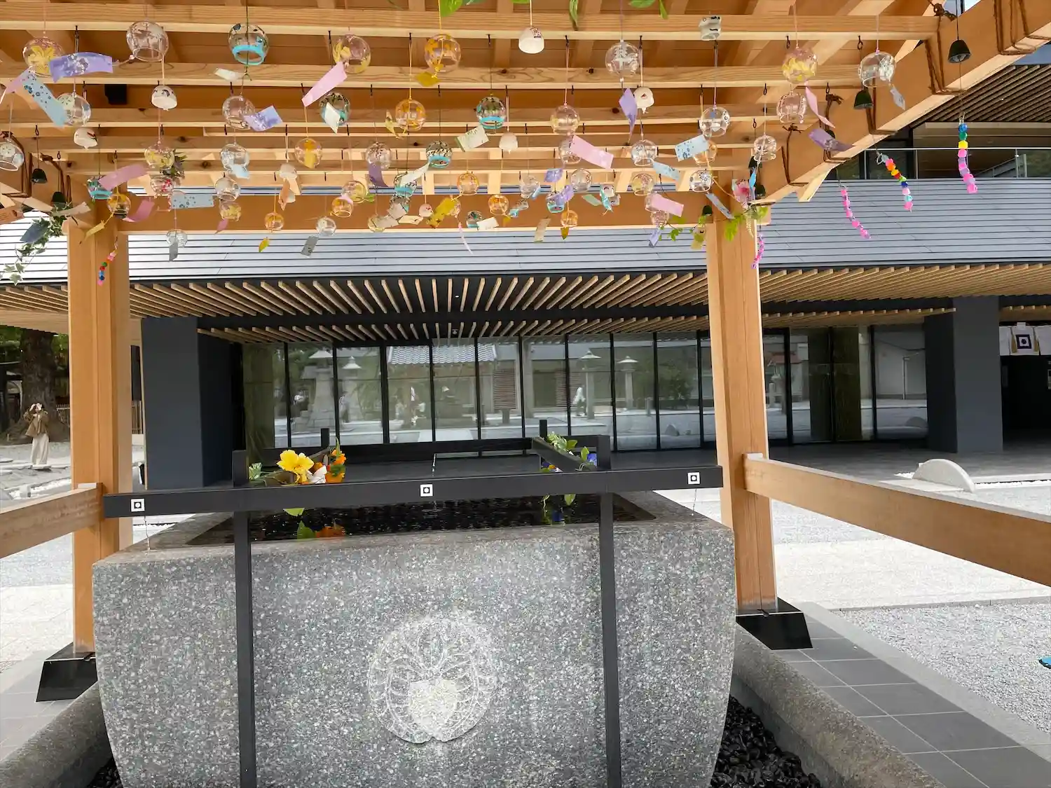 手水舎に風鈴が下がっていたり、中にビー玉が入っていて猛暑の中、一服の清涼感が味わえます。