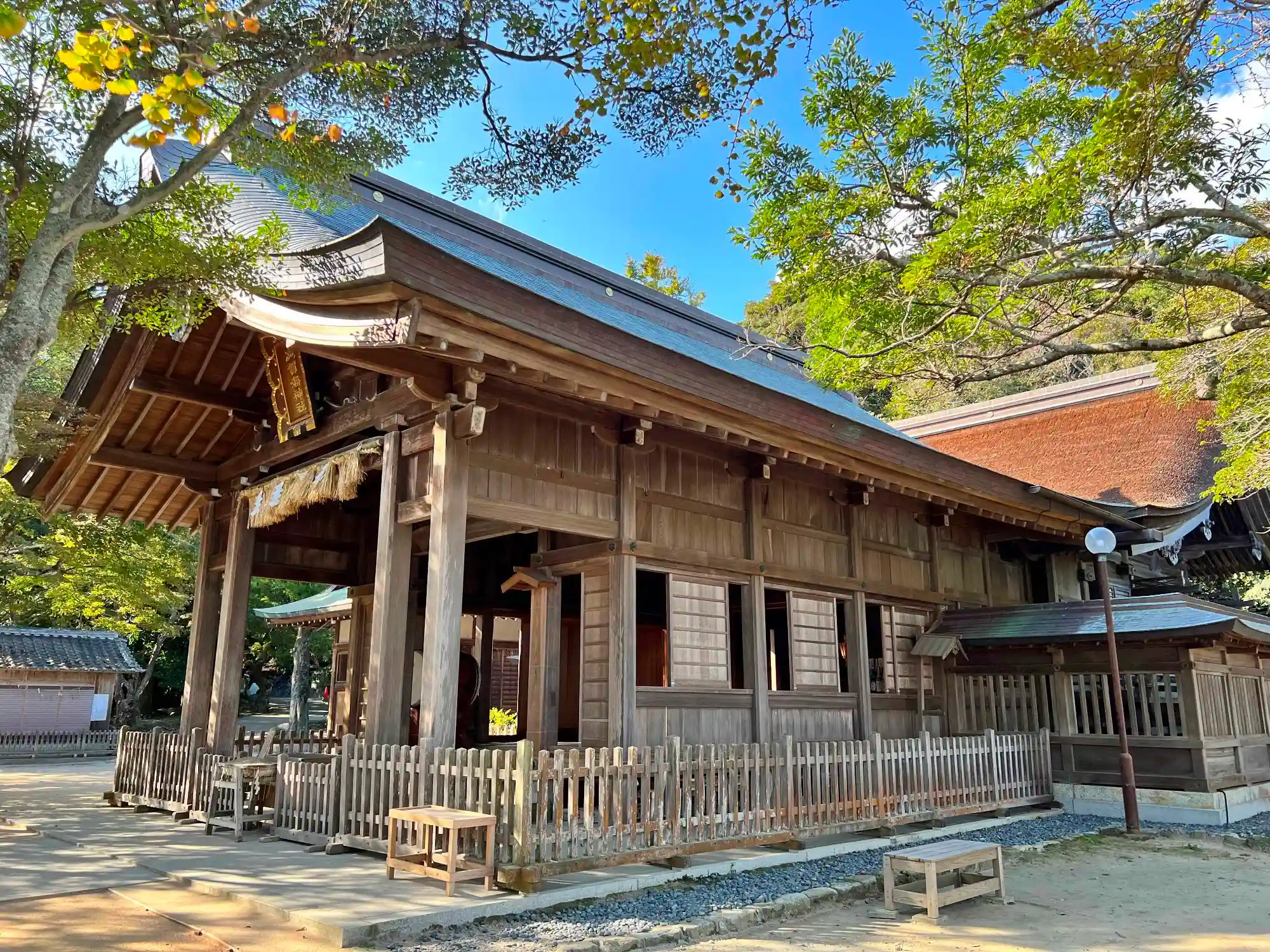 当社は、JR香椎線の終点・西戸崎駅の西方5km、志賀島の南東部の小丘の上にある。島にあるといっても、福岡市街からは海の中道を経由して陸路で行くことができる。境内は南北に長く、イメージとしては小丘の峰が参道になっている感じ。神門をくぐると神域で、社殿を中心に多くの境内社が立ち並ぶ。じっくり見て廻るとなかなか楽しめる。