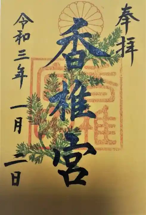 菊花紋章印と神社印に重ねて、右上に「奉拝」真ん中に「香椎宮」が墨書きされています。