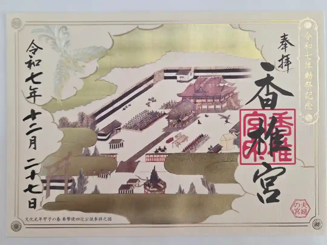 真ん中に「香椎宮」と墨書きされ神社印が重ねられています。上部に御神紋の菊紋が押されています。