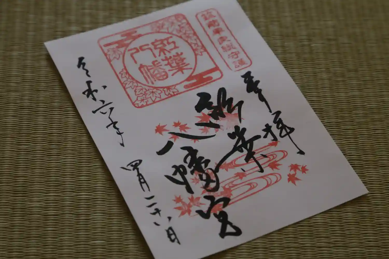 紅葉八幡宮の御朱印と紅葉の形をした絵馬。