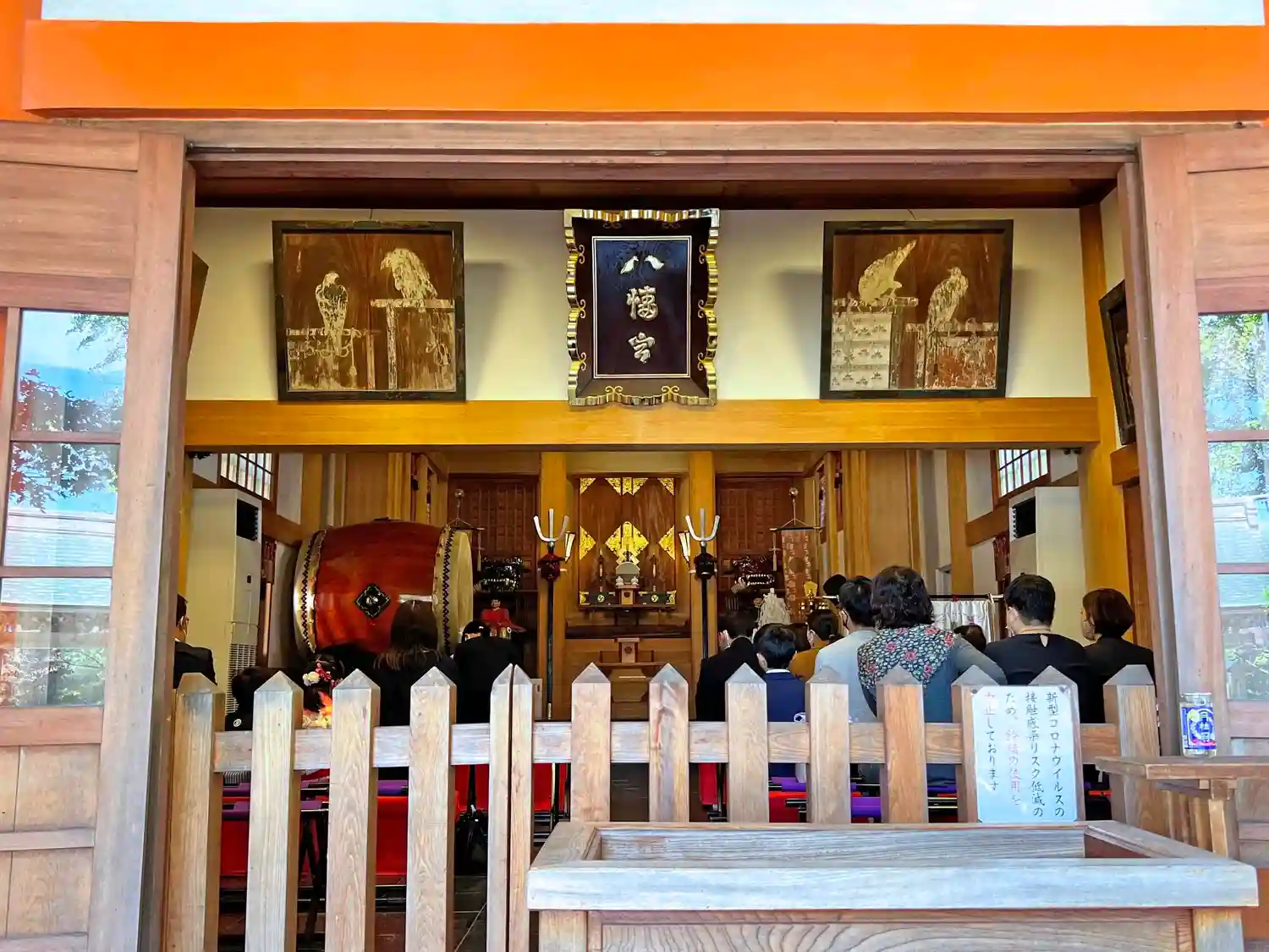 <拝殿>正面。正午前の参拝だったが、七五三の昇殿祈祷が人気のようで、拝殿内もごった返していた。