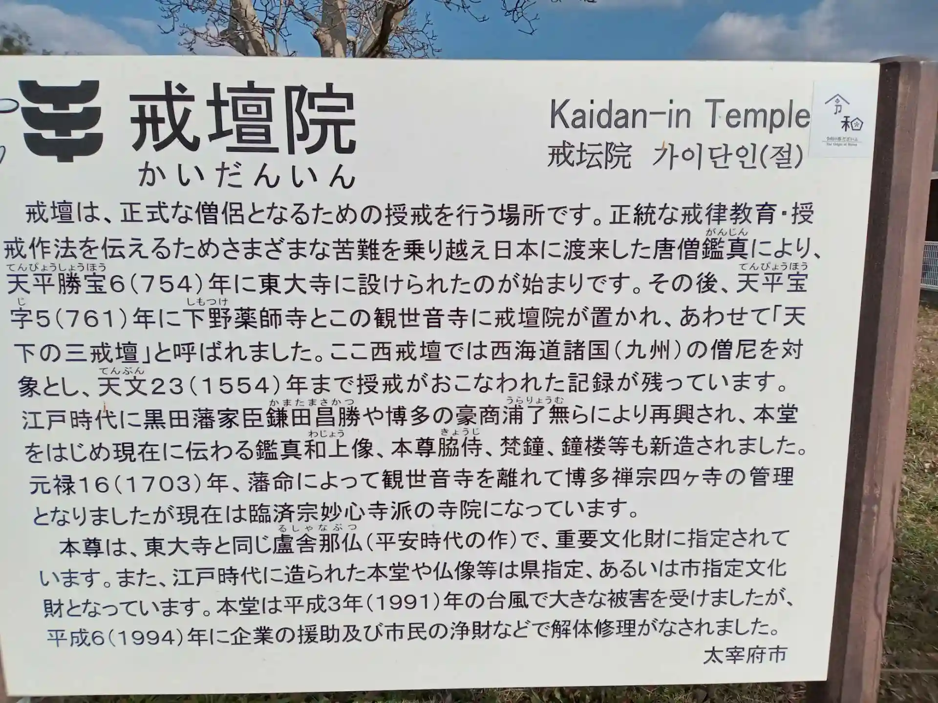 必要な戒律"を授けるためにつくられたお寺さんです。どうも"僧尼"を名乗る方々がおられたようで、具合の悪いことも出てきたそうです。そこで、"戒律を授ける"お寺さんが必要になったとのこと。誰でもなれるわけではないというふうにしたのですね。当時は、観世音寺さんの境内に建てられたとのことです。