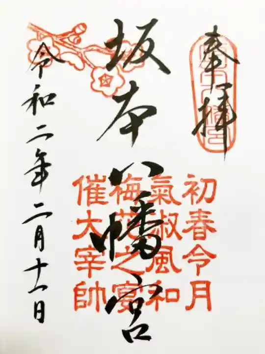 | 御朱印 | あり 令和の元号の典拠となった和歌「初春令月 気淑風和 梅花之宴 催大宰師」の朱印が「坂本八幡宮」の文字に重ねられています。 |