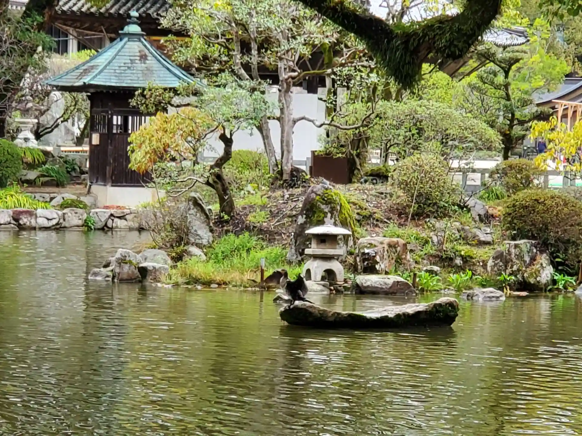 とここで、心字池の大きな石の上で大きな鳥が羽を広げてアピール?