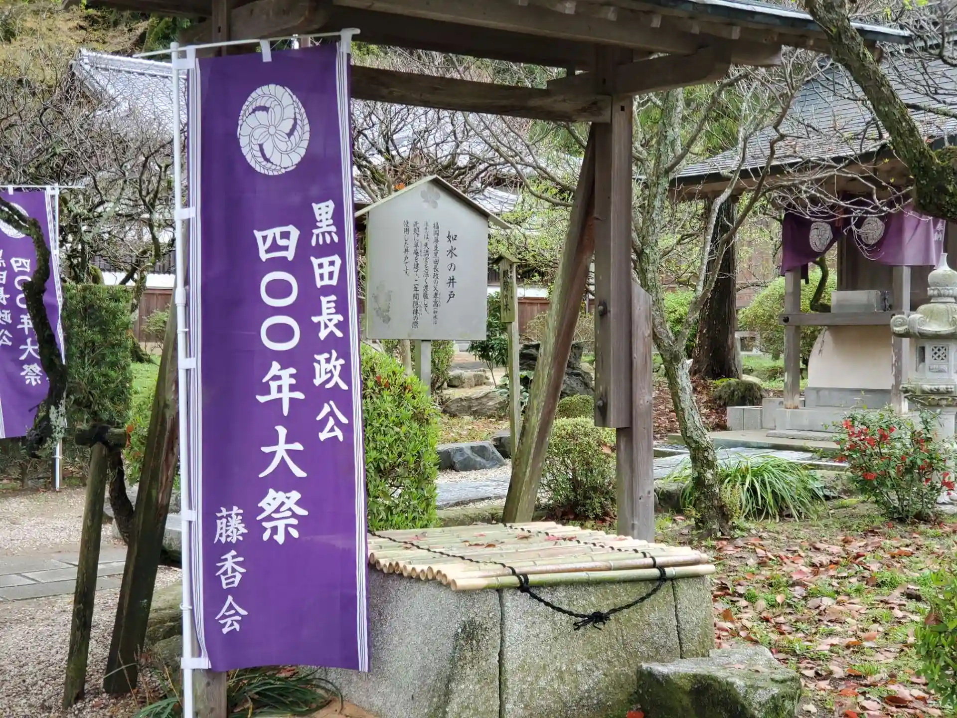 黒田家ゆかりの眼薬の木(右)と黒田官兵衛の御霊を祀る祠
