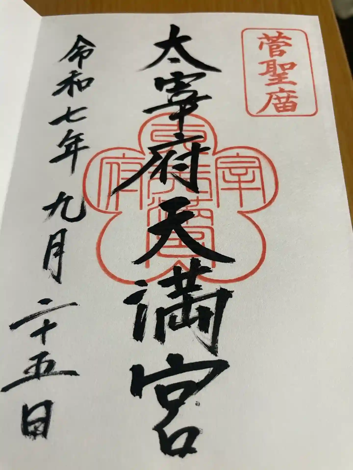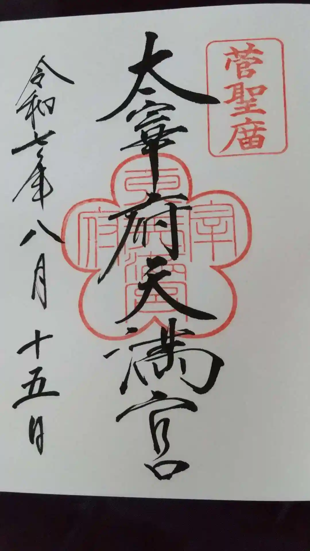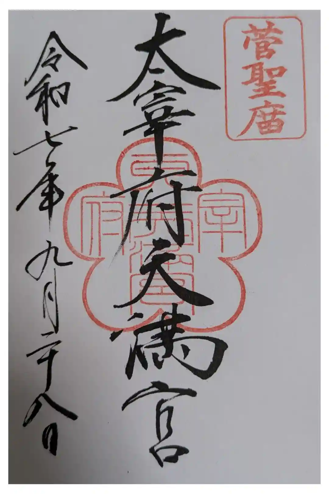 真ん中に太宰府天満宮の神社印、右上に「菅聖庿」の朱印が押された御朱印。