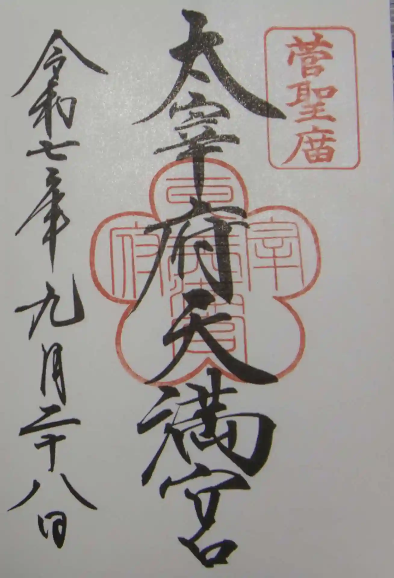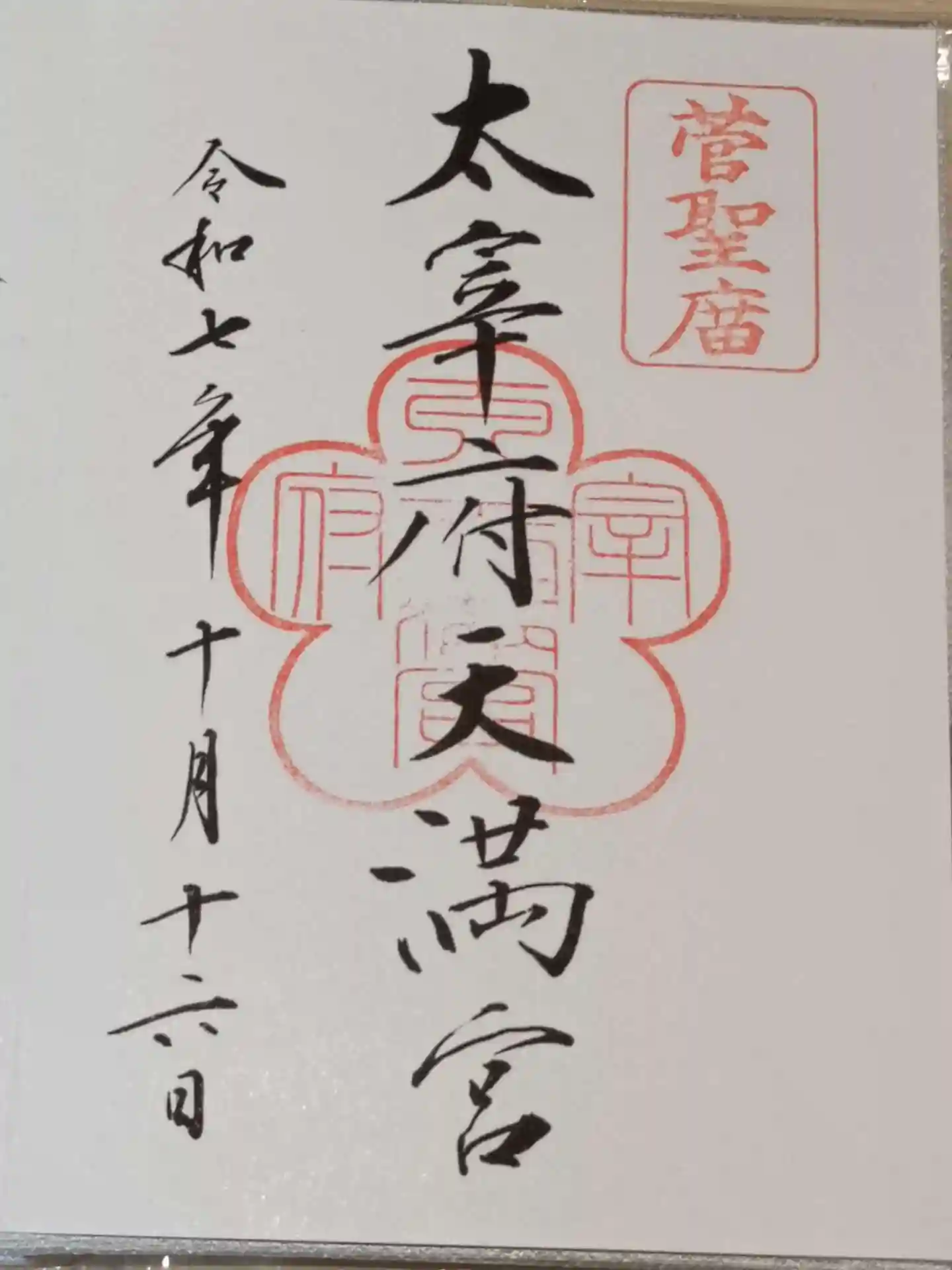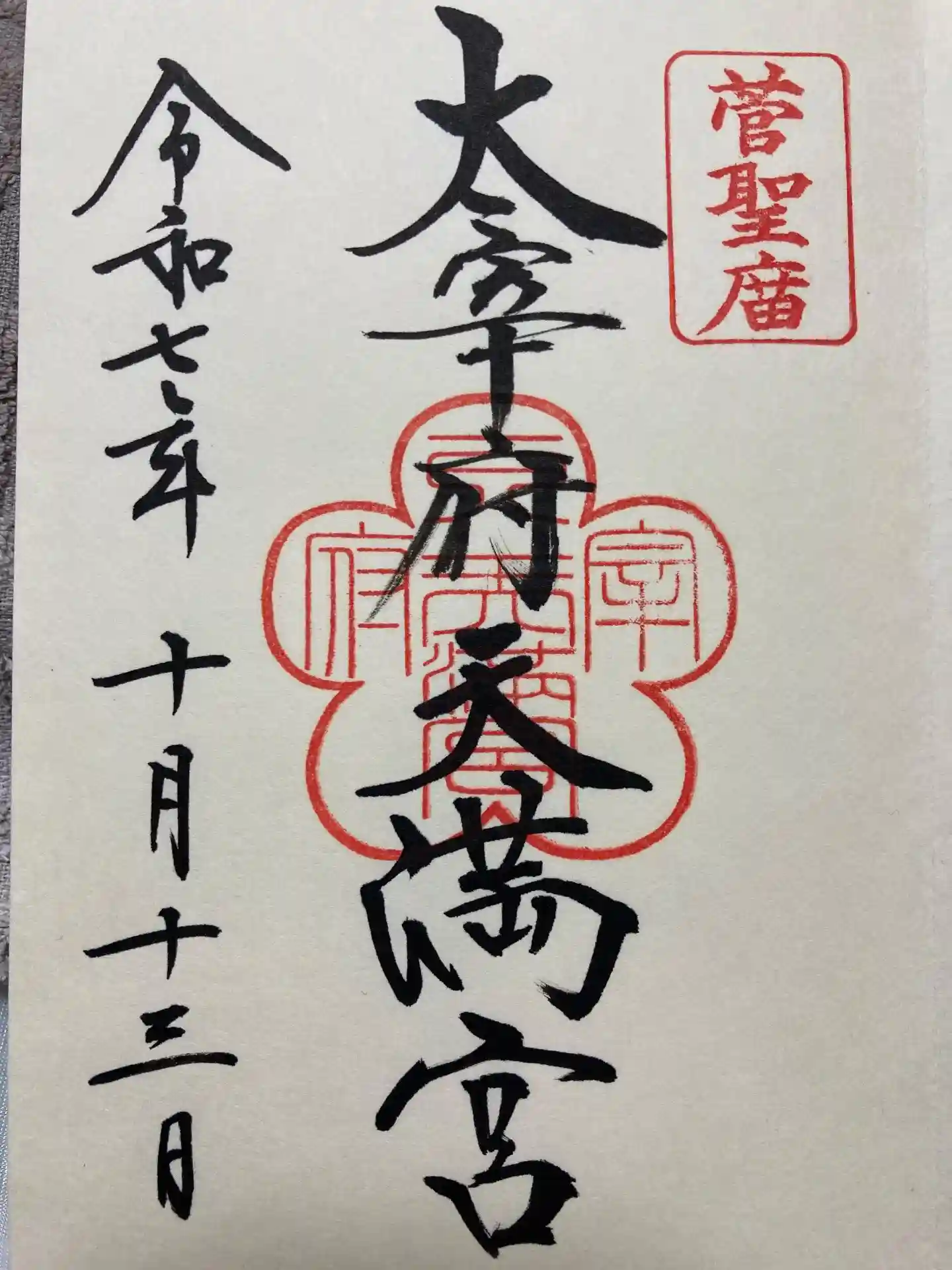 真ん中に太宰府天満宮の神社印、右上に「菅聖庿」の朱印が押された御朱印。
