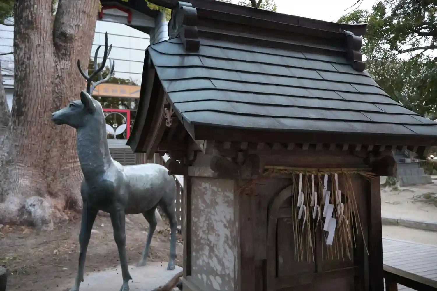 仮殿の屋根を見上げると樹木が繁っており、境内に自…