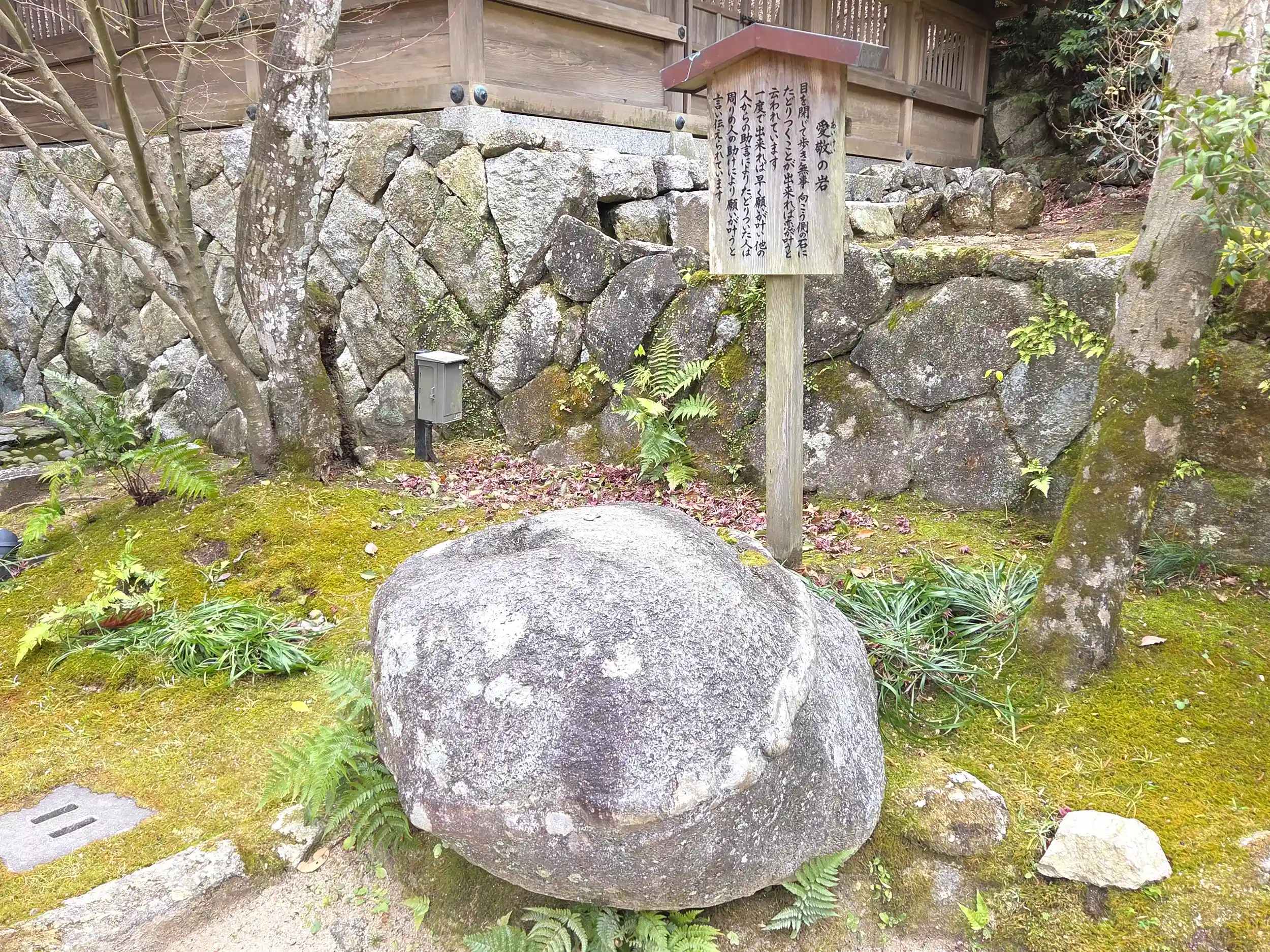 もうひとつ同じような岩が境内にあり、目を閉じて歩き、無事に向こうの石に辿り着くことが出来れば恋が叶うと云われているそうです。