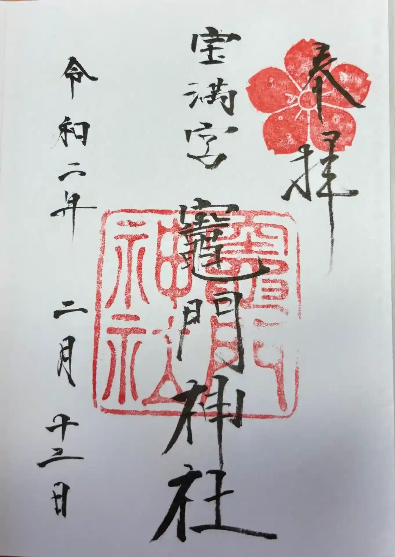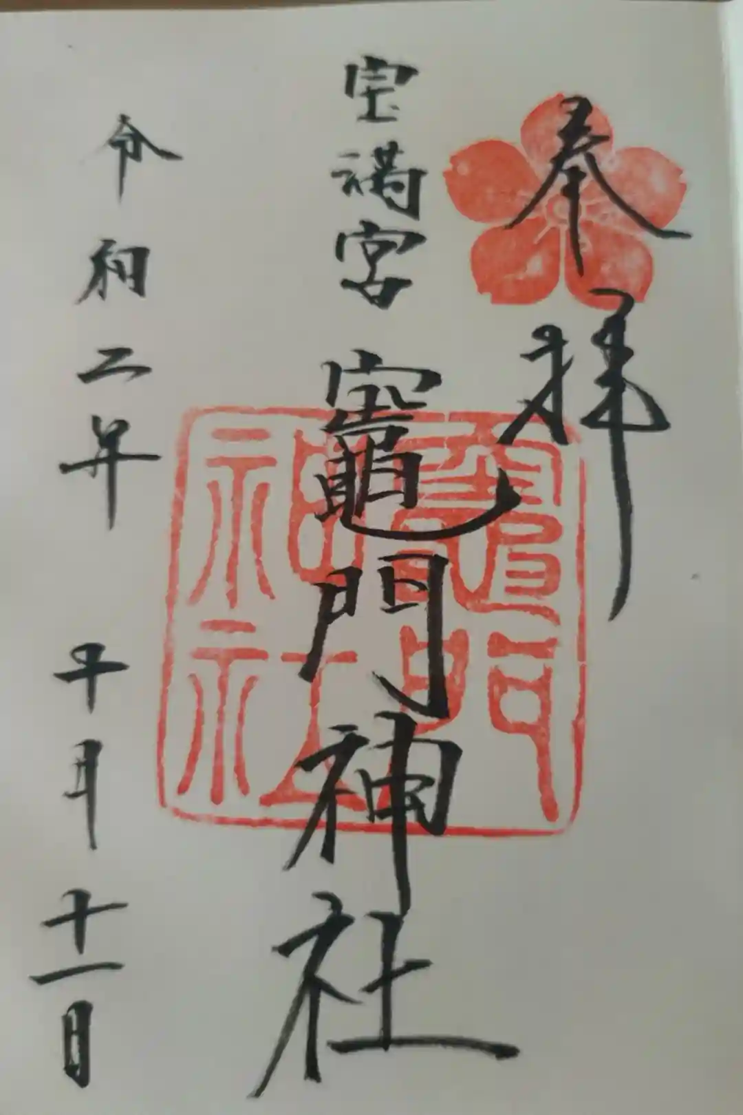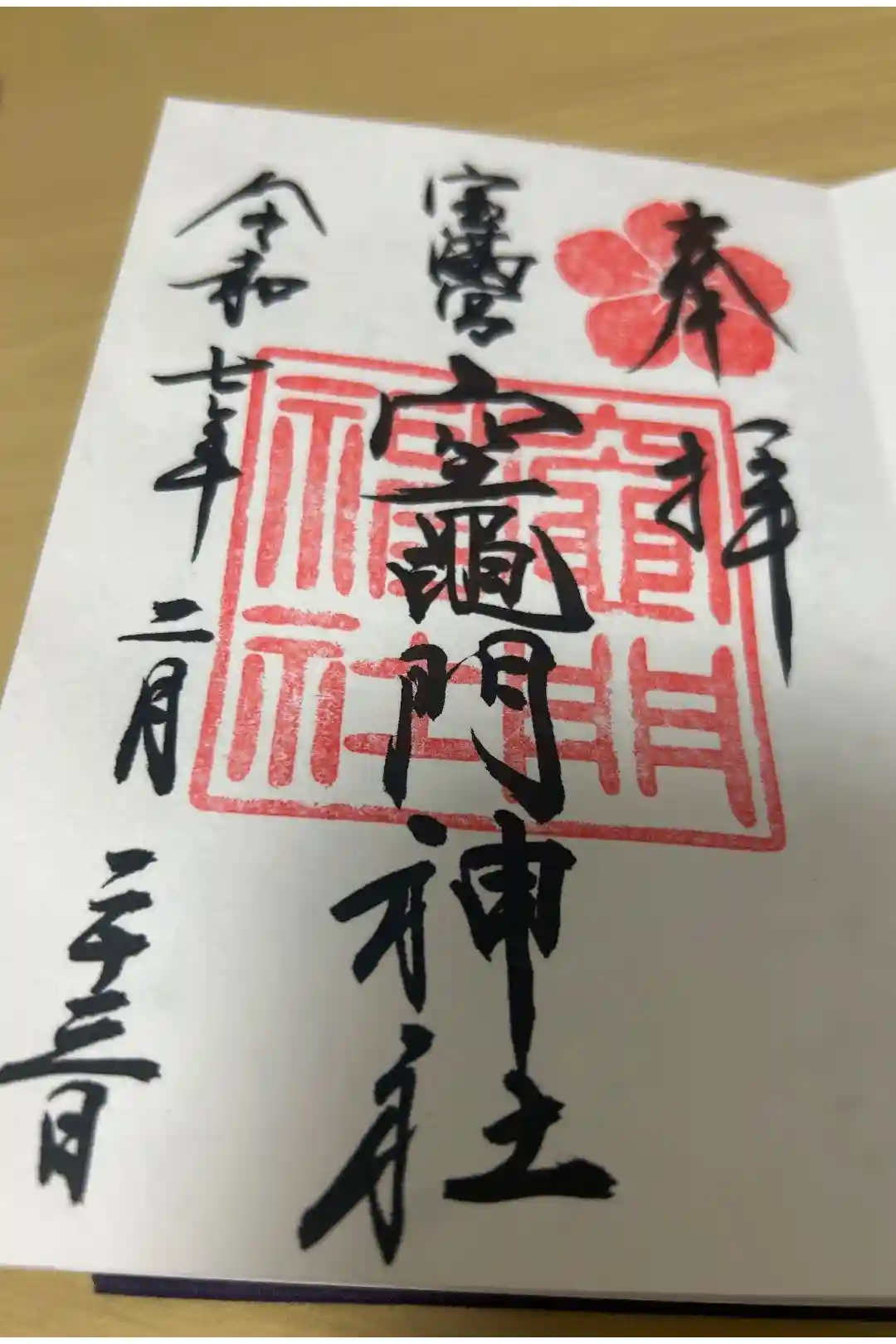 真ん中に宝満宮竈門神社と書かれ、右上に竈門神社の社紋である桜の印、真ん中に竈門神社の社印が押されています。