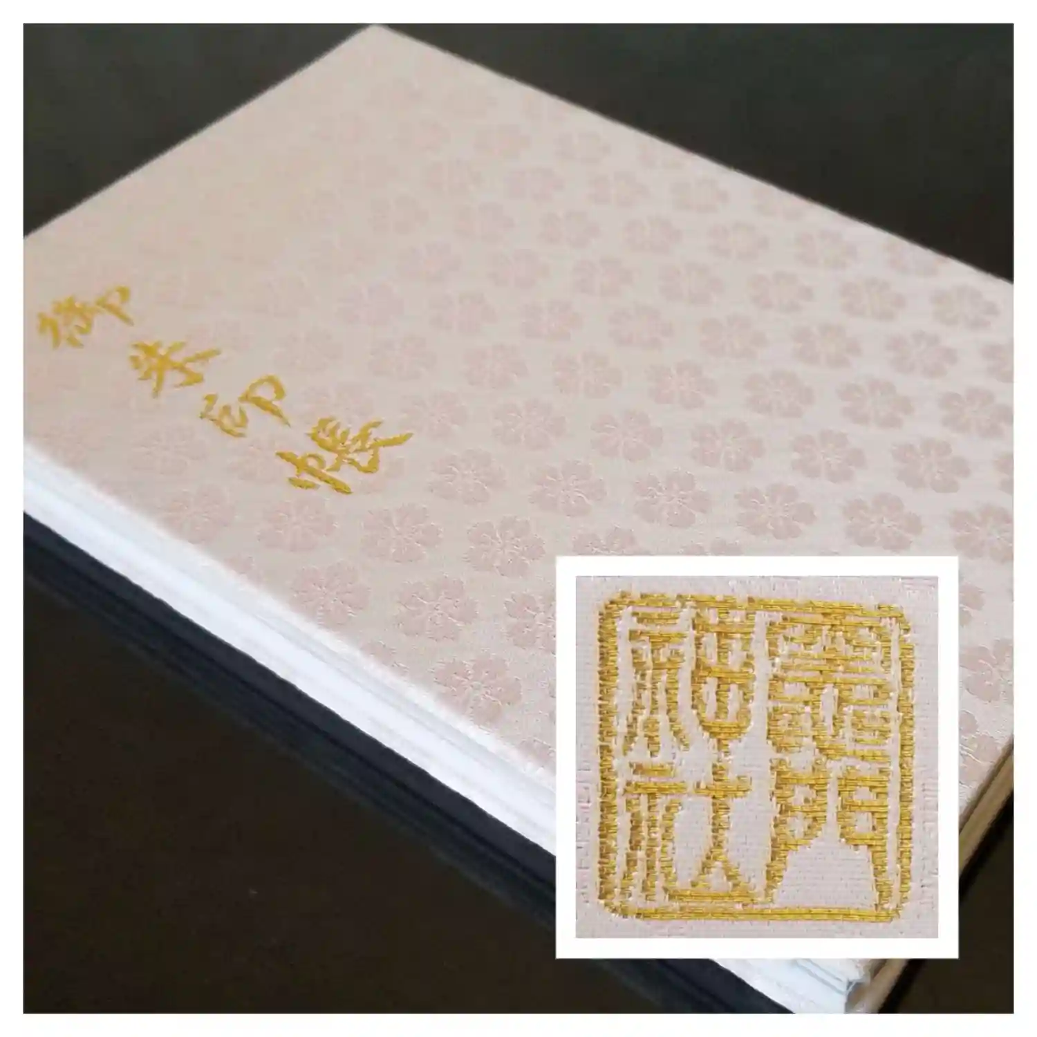 地には竈門神社の社紋である桜文様、表面の左上に御朱印帳の文字、裏面の真ん中に竈門神社の社印が入っています。