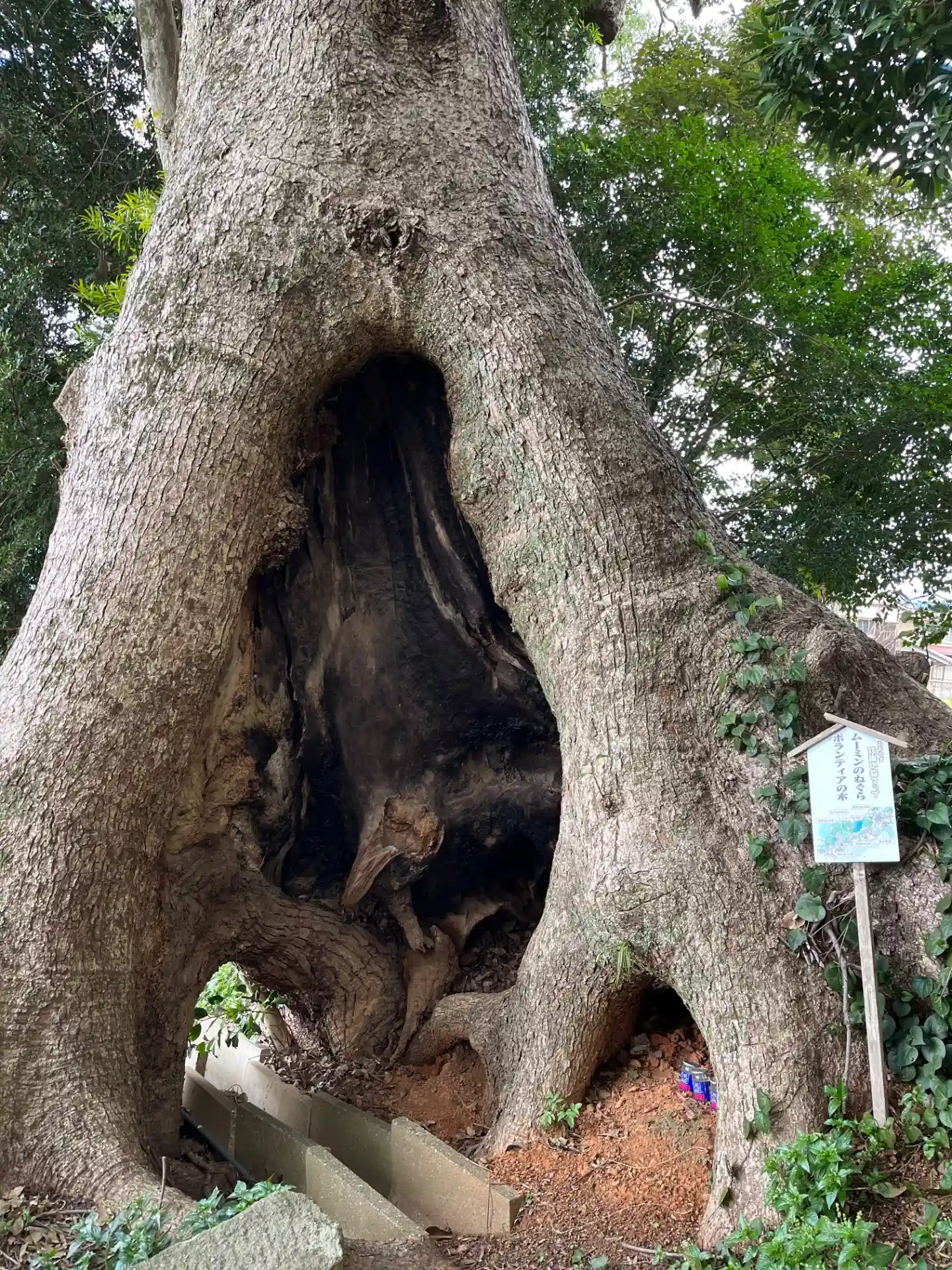 階段を登るとムーミンの木があります、大きくて立派な木でした。また、ムーミンの隠れ家の木もあり自然の中で気持ちいい日になりました。