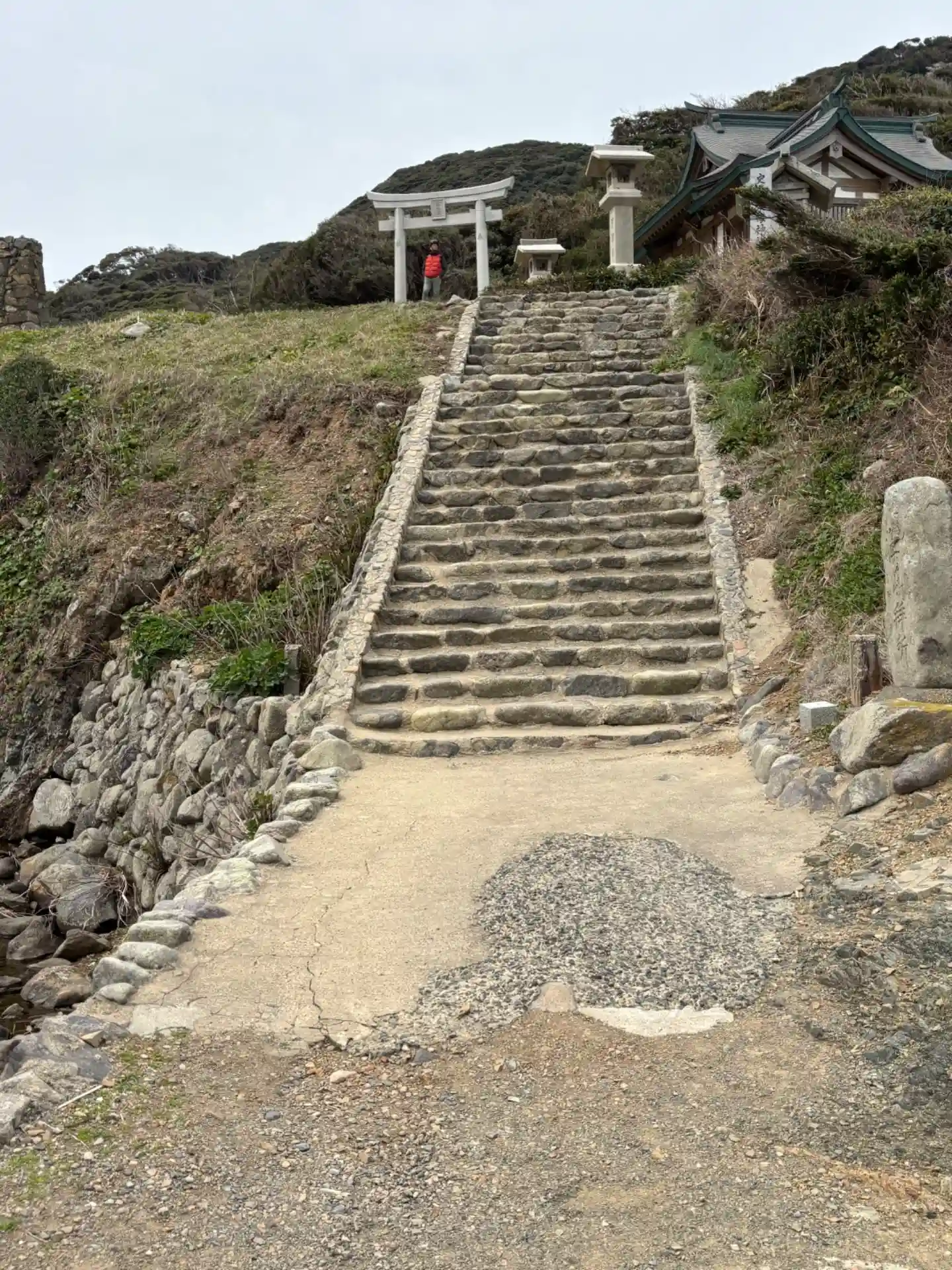 梅雨空のもと。幸い雨には遭いませんでした。上ったり下ったり、ゆっくりと歩いて、港から35分くらいかかりました。🚶🚶