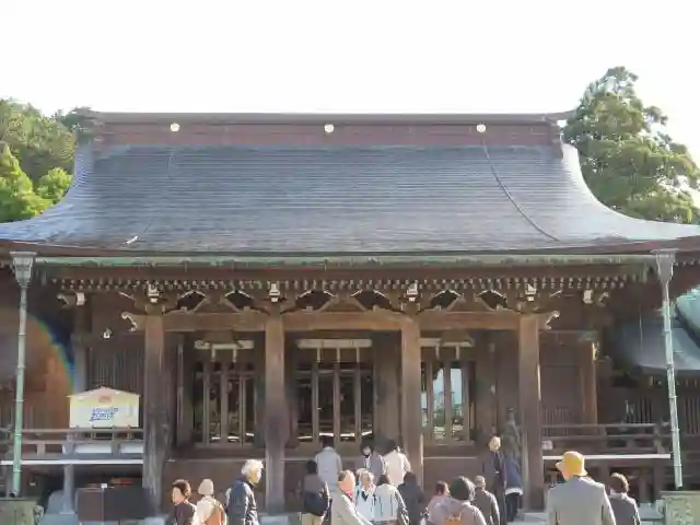 本殿 ここは通常は大注連縄(おおしめなわ)がかかっていますが、私がいった時はちょうど取り換え中で「注連縄がない」という珍しい状態でした