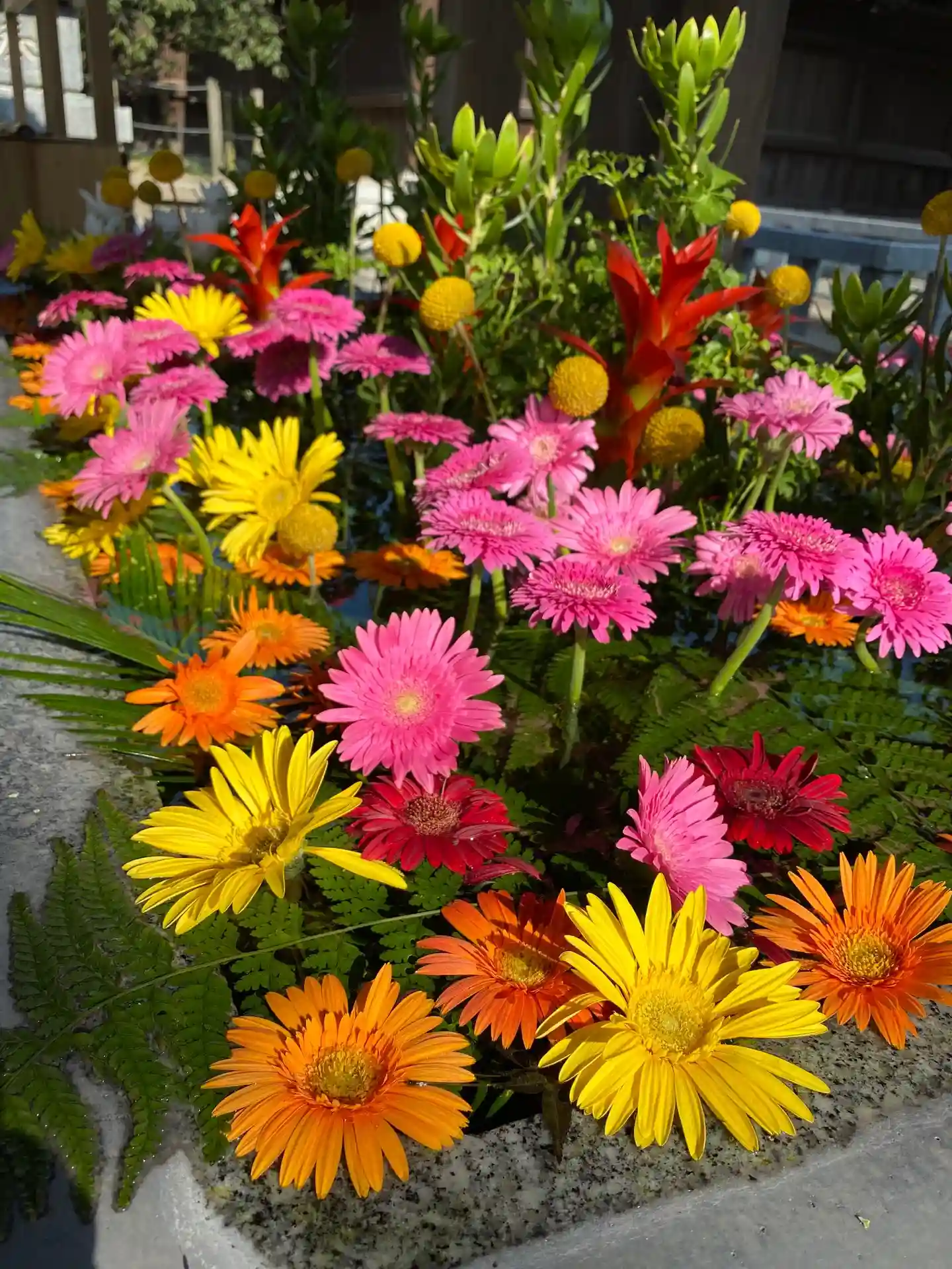 花手水が向日葵からガーベラに変わりました。