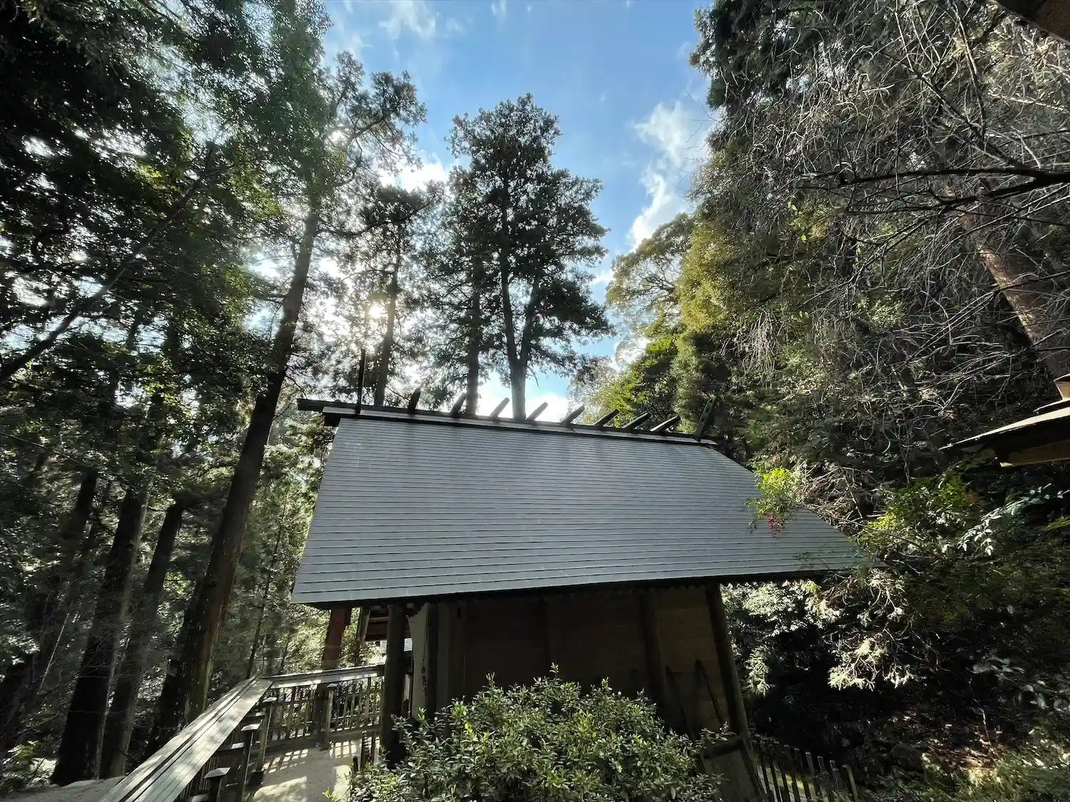 拝殿は伊勢神宮を模してるとの事で伊勢神宮の式年遷宮で建て替えられた際に出た木材で再利用し建て替えられてるそうです。