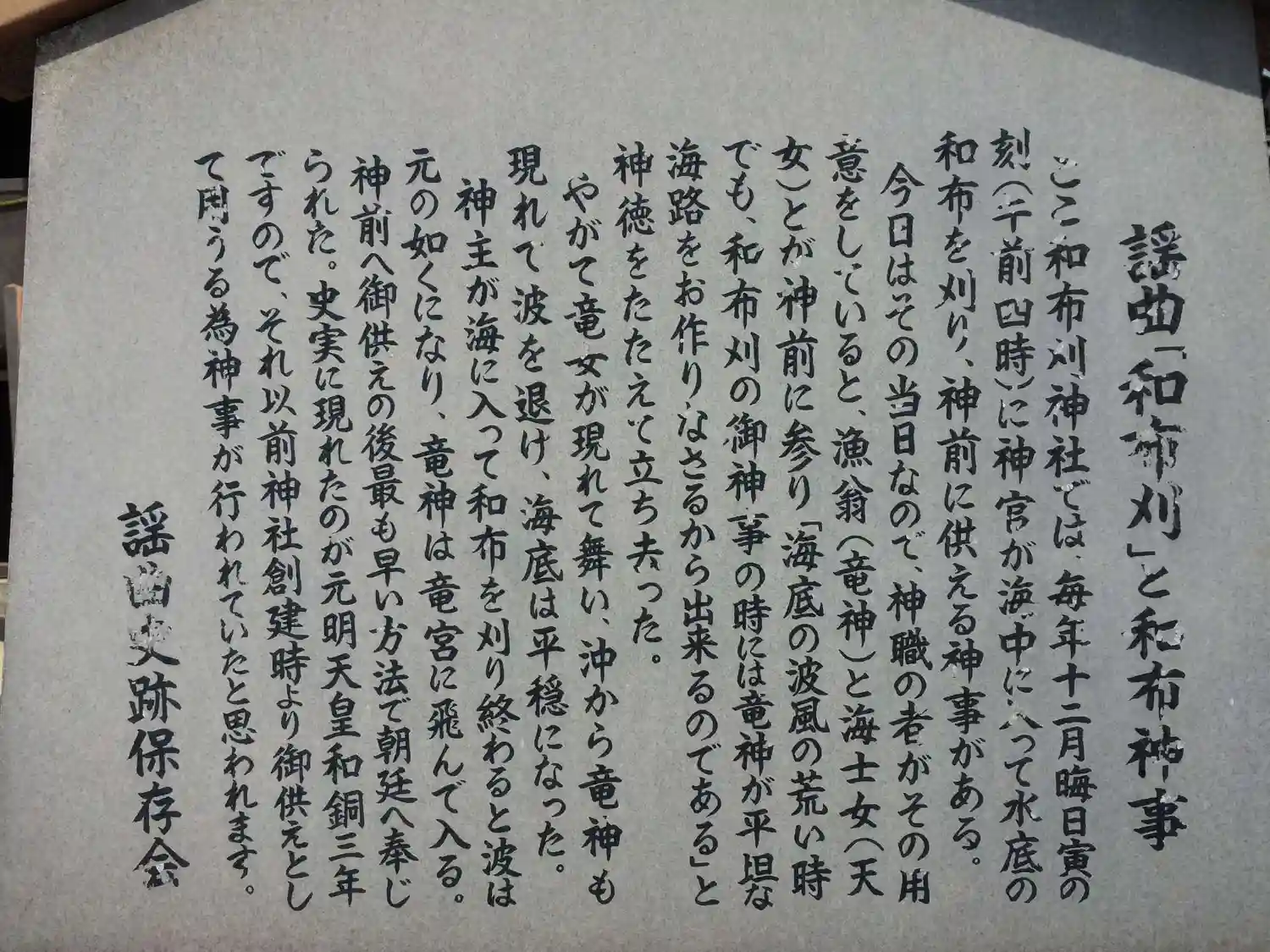 神事は、毎年旧暦大晦日の深夜から元旦にかけての干潮時に行われます。三人の神職がそれぞれ松明、手桶、鎌を持って海に入り、わかめ刈り採って、神前に供えます。