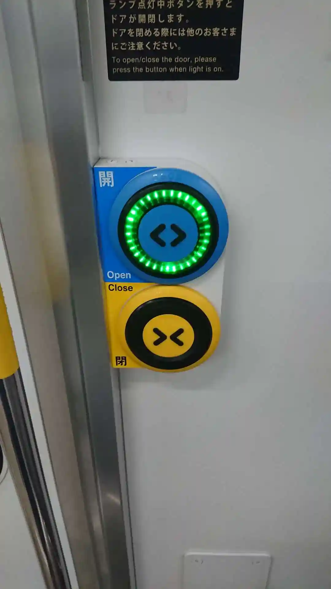 これは車内の扉開閉ボタン。海外の信号のボタンデザインのようで、大きくて可愛いです。実はプロダクトデザインマニアでもあります。えへへ。