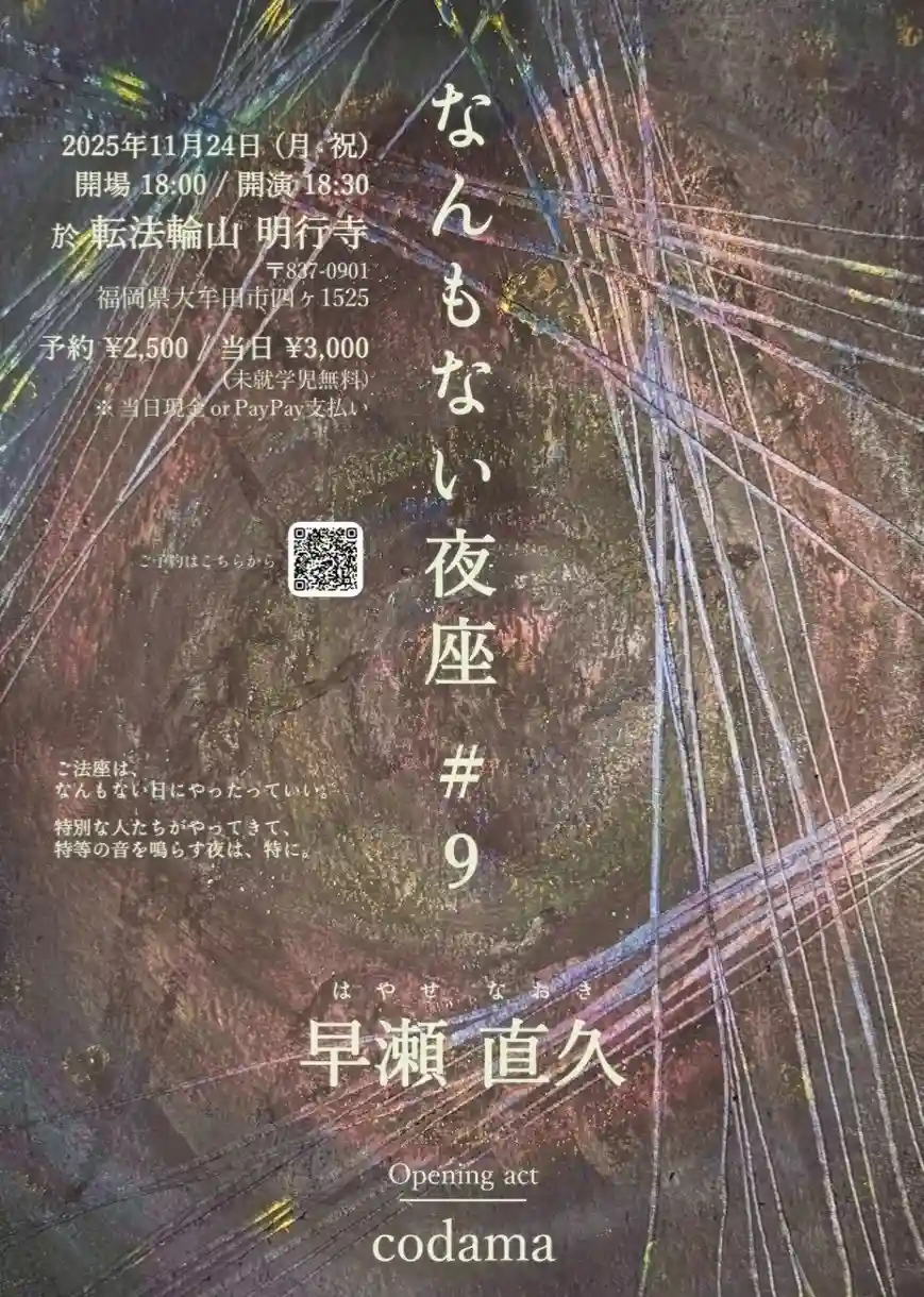 ご法座は、なんもない日にやったっていい。特別な人たちがやってきて、特等の音を鳴らす夜は、特に。というコンセプトのもと、2023年に始まった「なんもない夜座」が、9回目を迎えます。