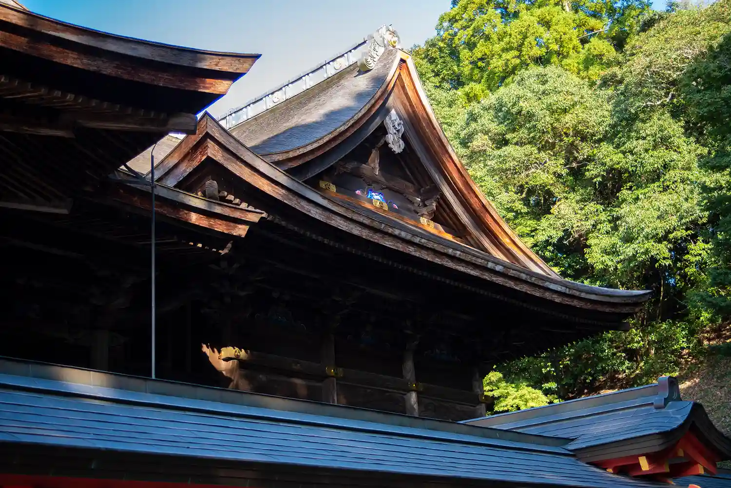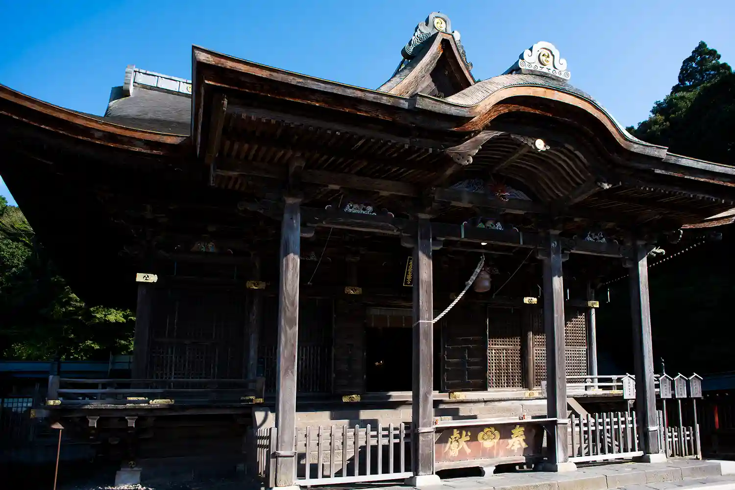 斜めから<拝殿>全景。基本シックで彩色はないが、軒下の彫刻のみ色付けされいる。