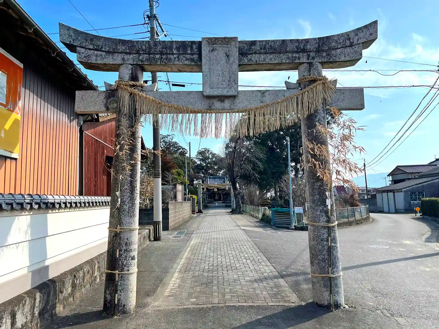 境内の50mほど西方にある<鳥居>。石扁額には「八幡神社」の文字。