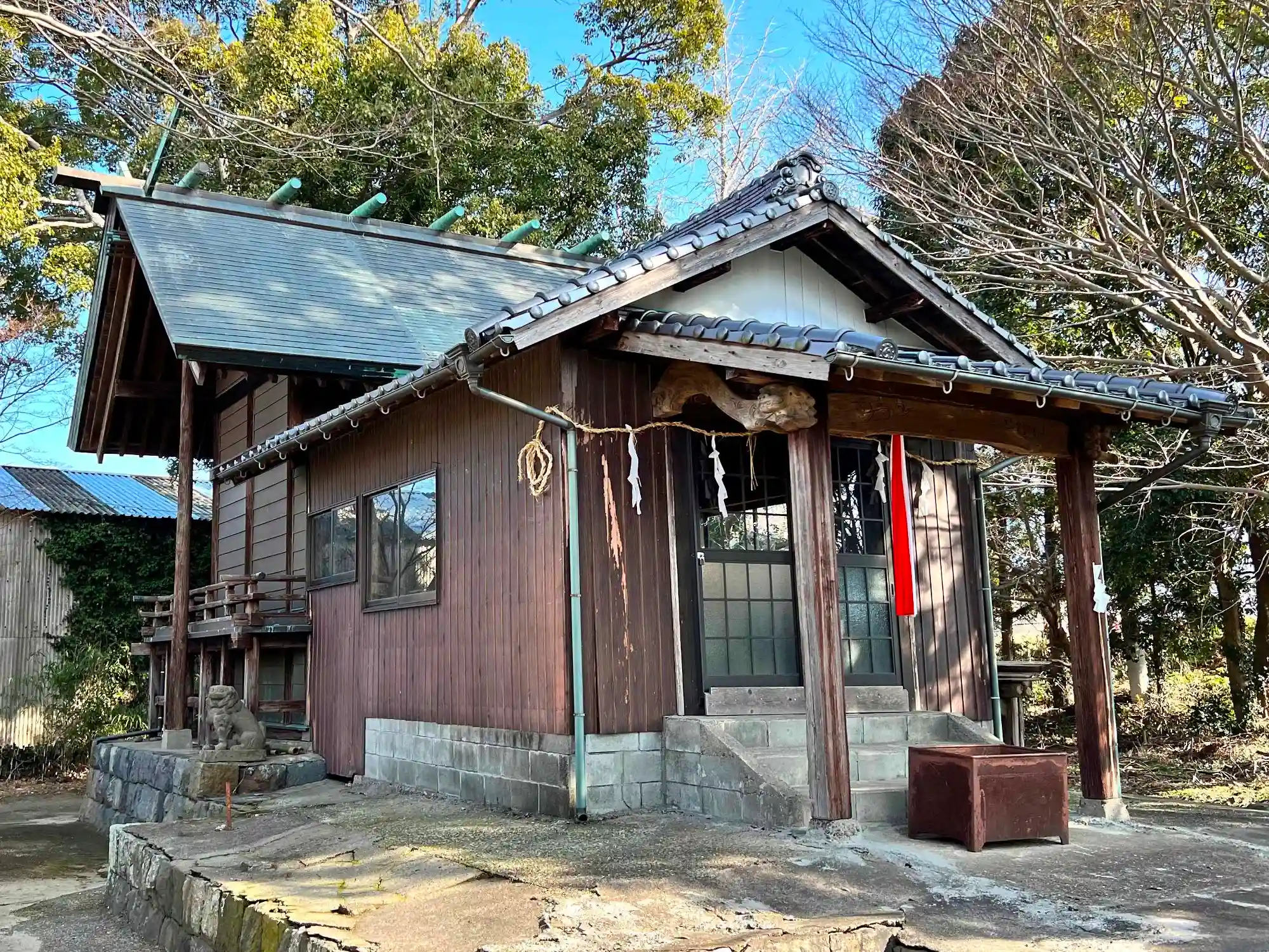 当社は、西鉄甘木線・大城駅の南東1.5km、道のり2.2kmの、筑後川南岸の耕作地の中、平地にある。筑後川南岸に沿って伸びる県道81号線から少し南に入ったところにあるが、すぐ近くに当社よりも社叢が大きい南宮司宮地嶽神社があって間違いそうになる。水田脇にある当社は境内は広くはなく、社殿も小ぢんまりとした、いかにも地元民のための村の鎮守といったところ。特徴としては、小さな石仏を祀る弘法大師堂という建物があることと、社殿は小さいながらも本殿は神明造のしっかりとした建物であること。
