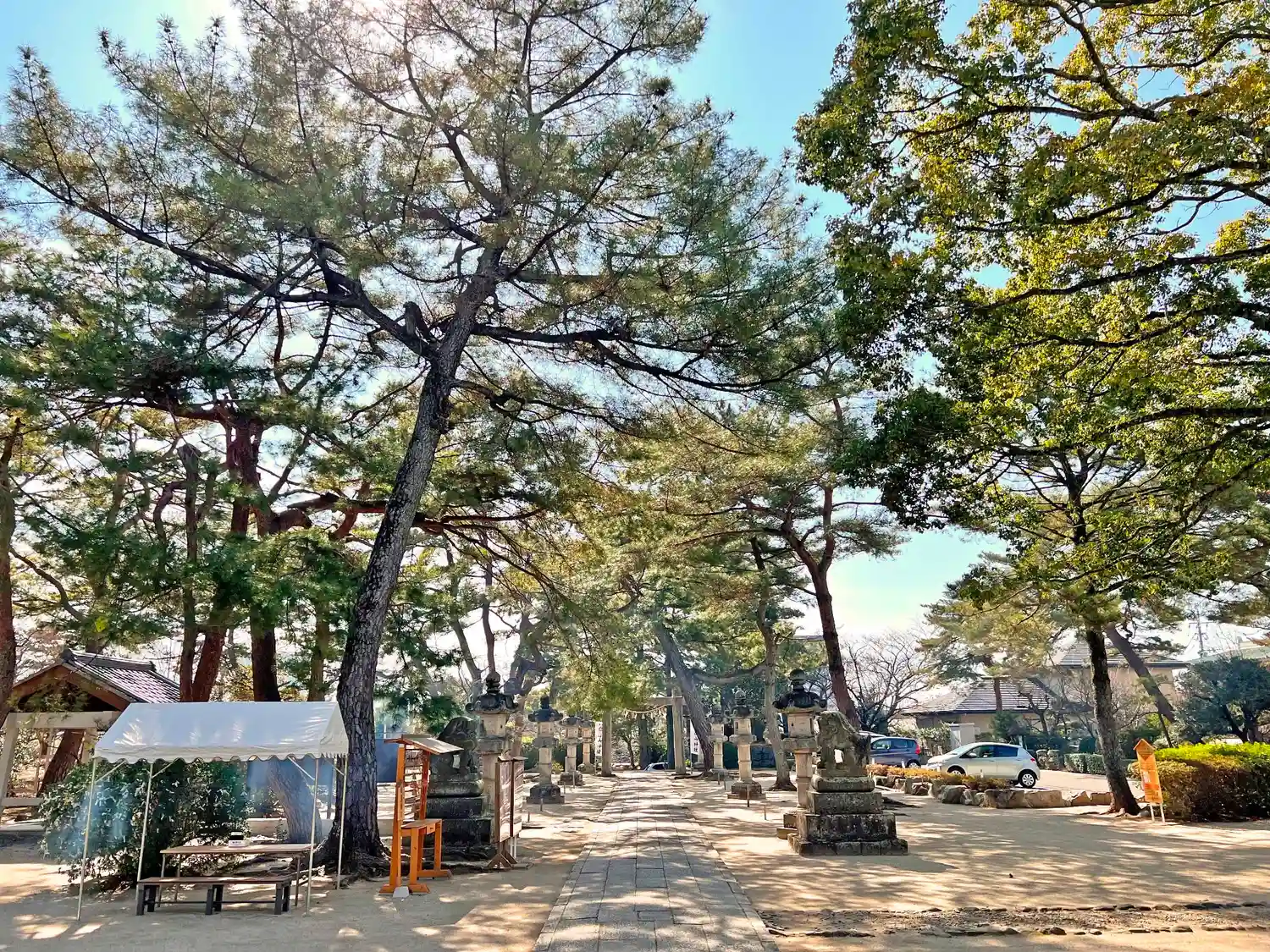 拝殿から振り返って境内全景。松の高木が古社らしさを感じさせてくれる。