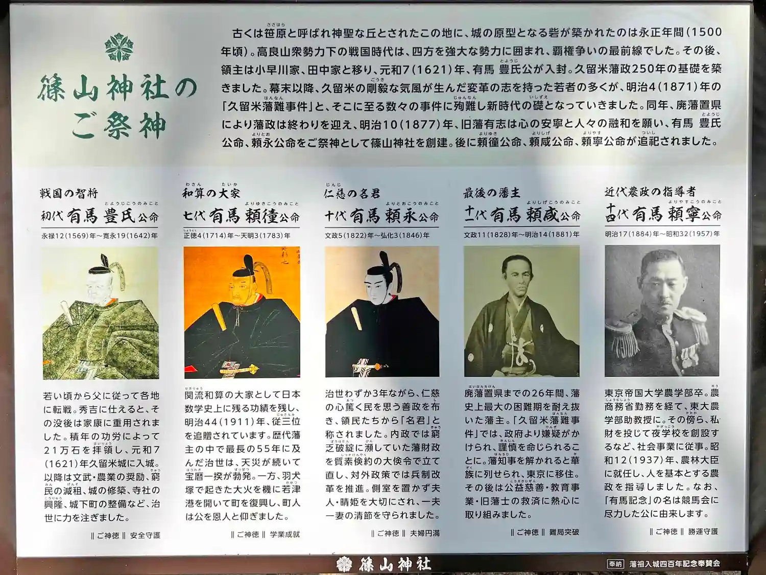 境内はこの地を治めた有馬氏の居城久留米城跡…祭神の有馬頼徸(ありまよりゆき)は和算の大家で、学生、…