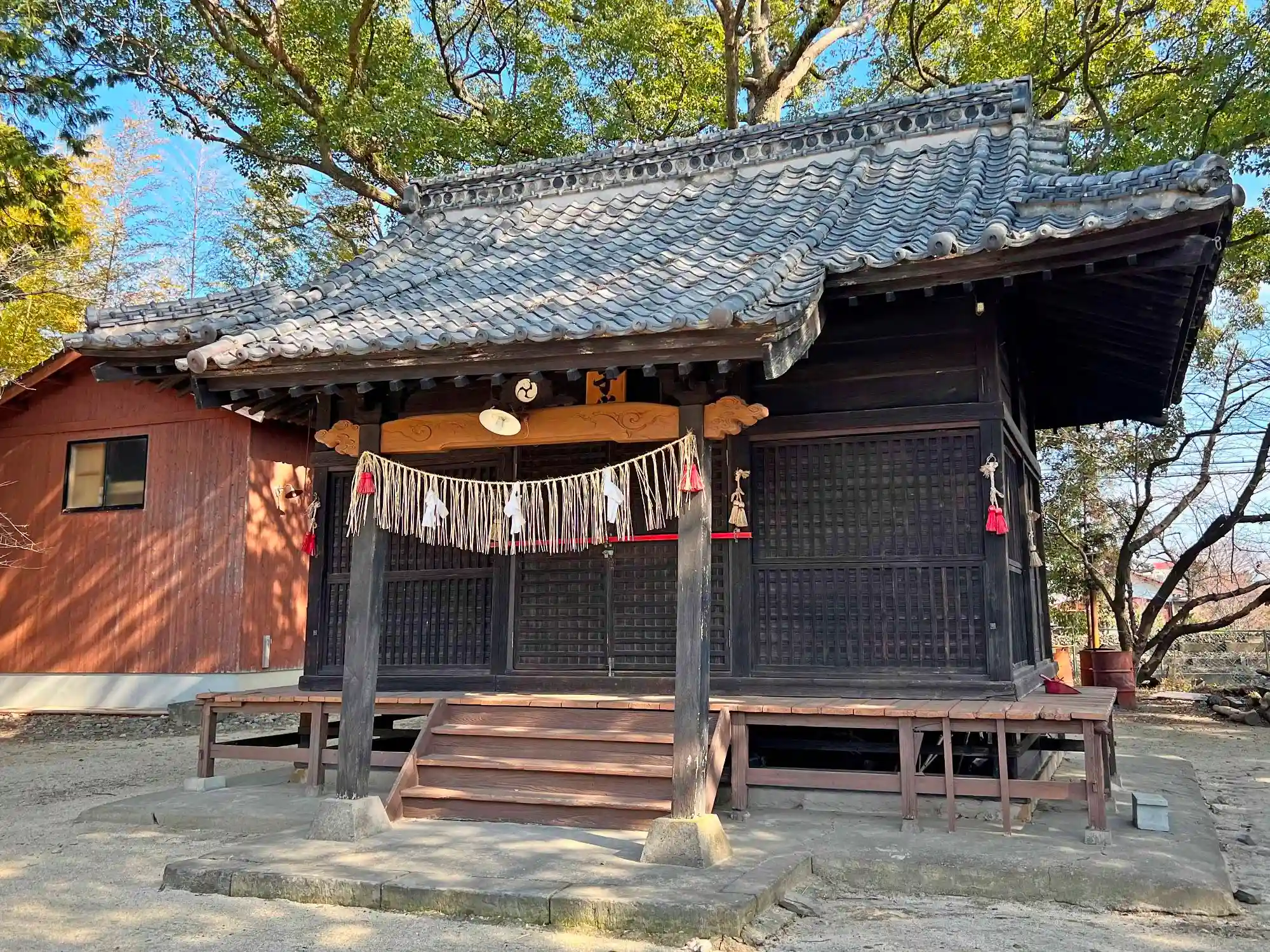 社殿左奥の境内社群。左から順に<黒岩社>、<祇園社>、<恵比須社>。