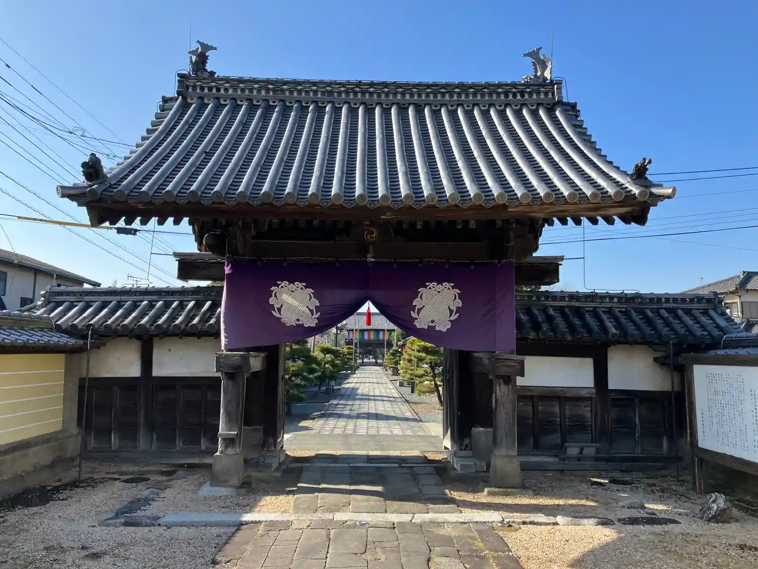 参道を進むと、当寺内最古の建物である<大門>がある。江戸時代初期1651年の建立、切妻造本瓦葺の四脚門。