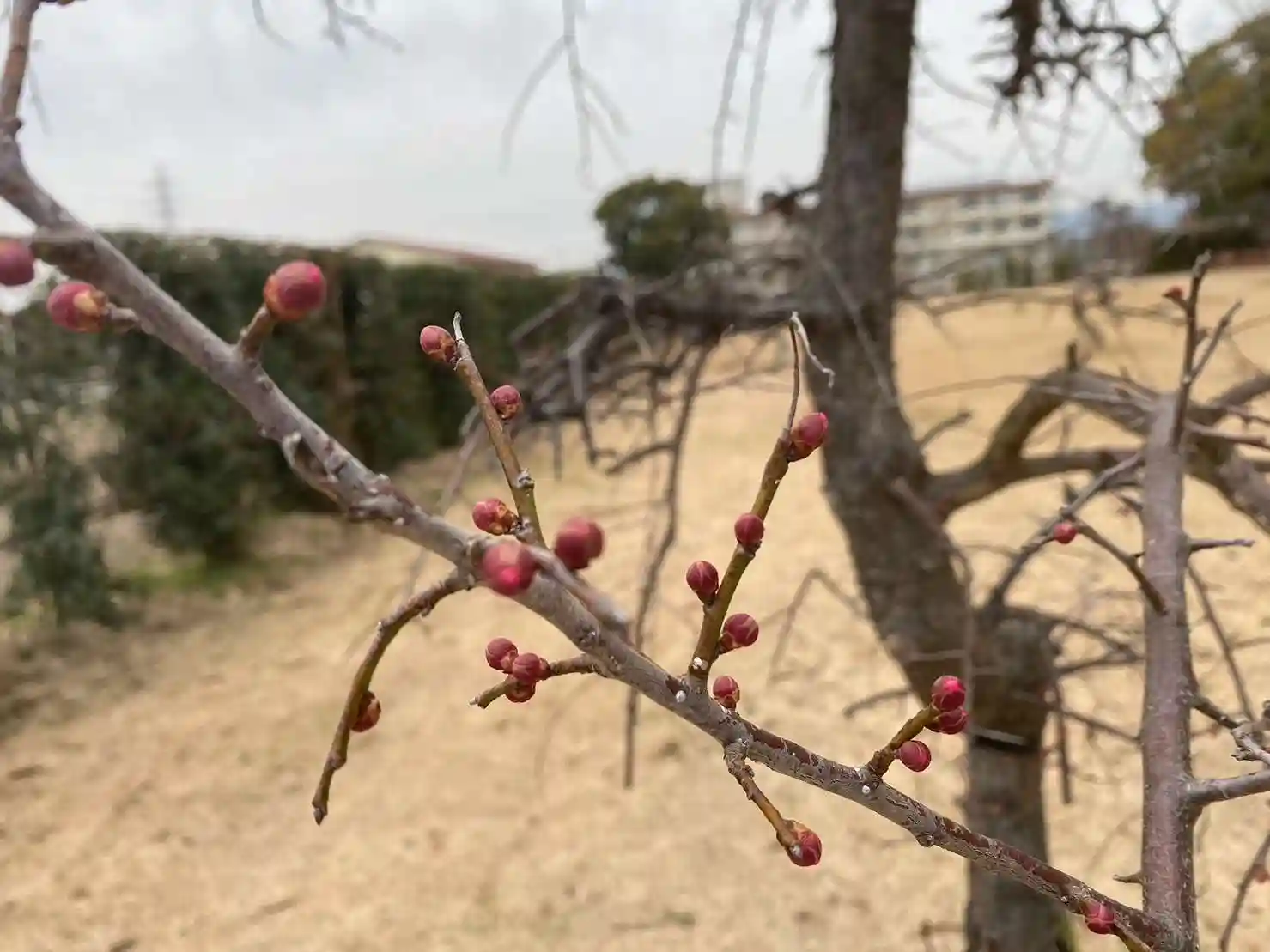 しだれ梅はまだつぼみですが、赤い部分が日に日に増えています。