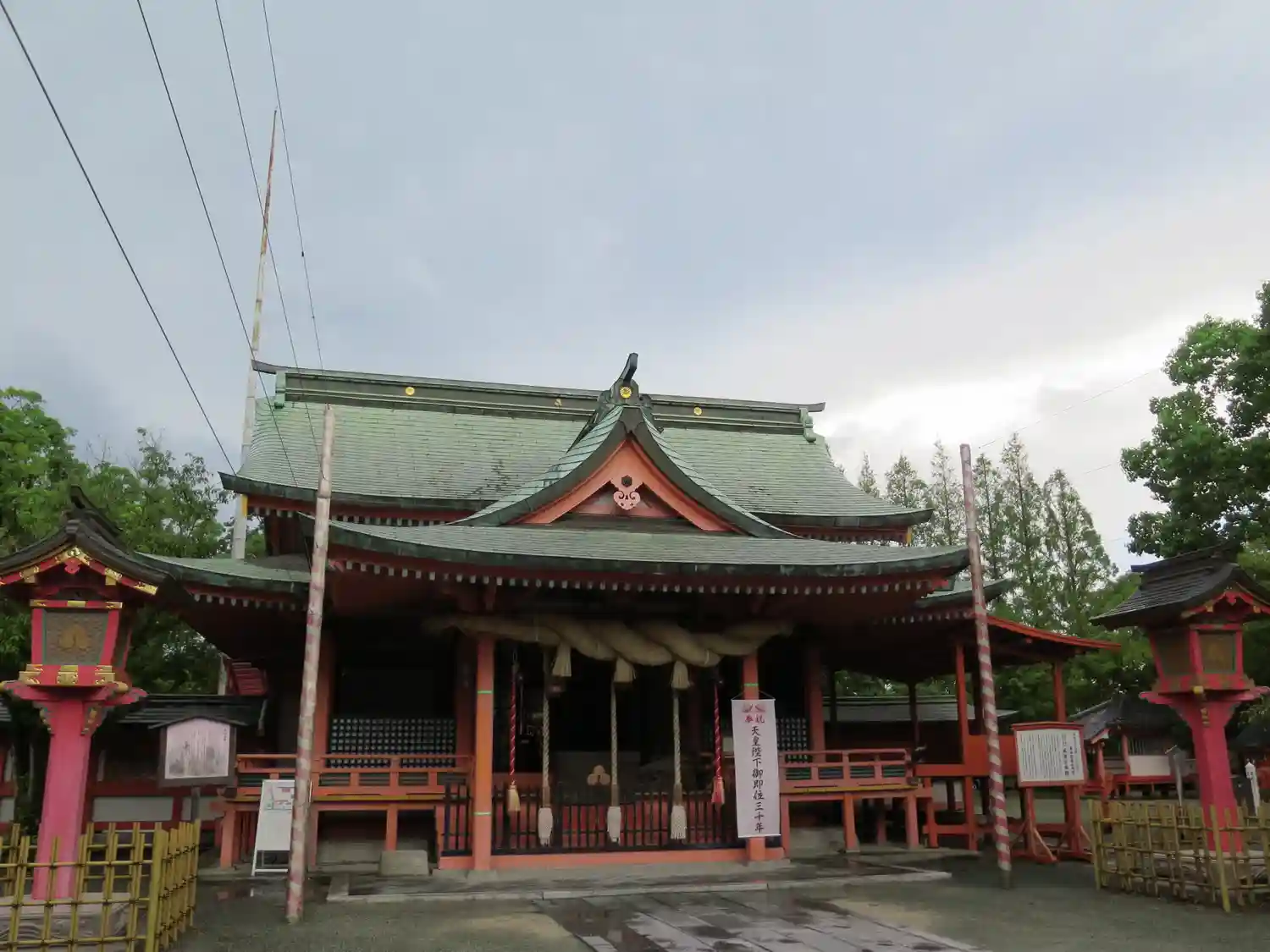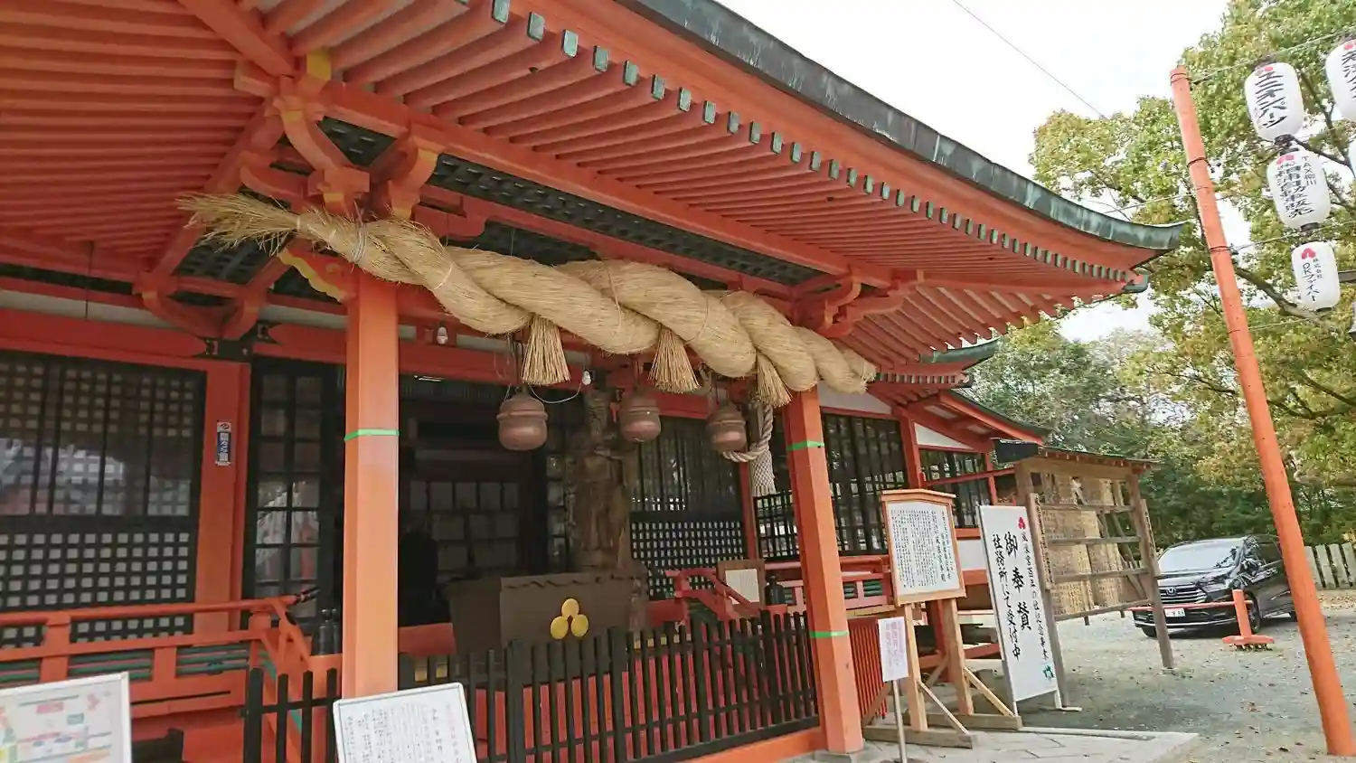 <拝殿>正面。向拝下の極太の注連縄が圧巻。